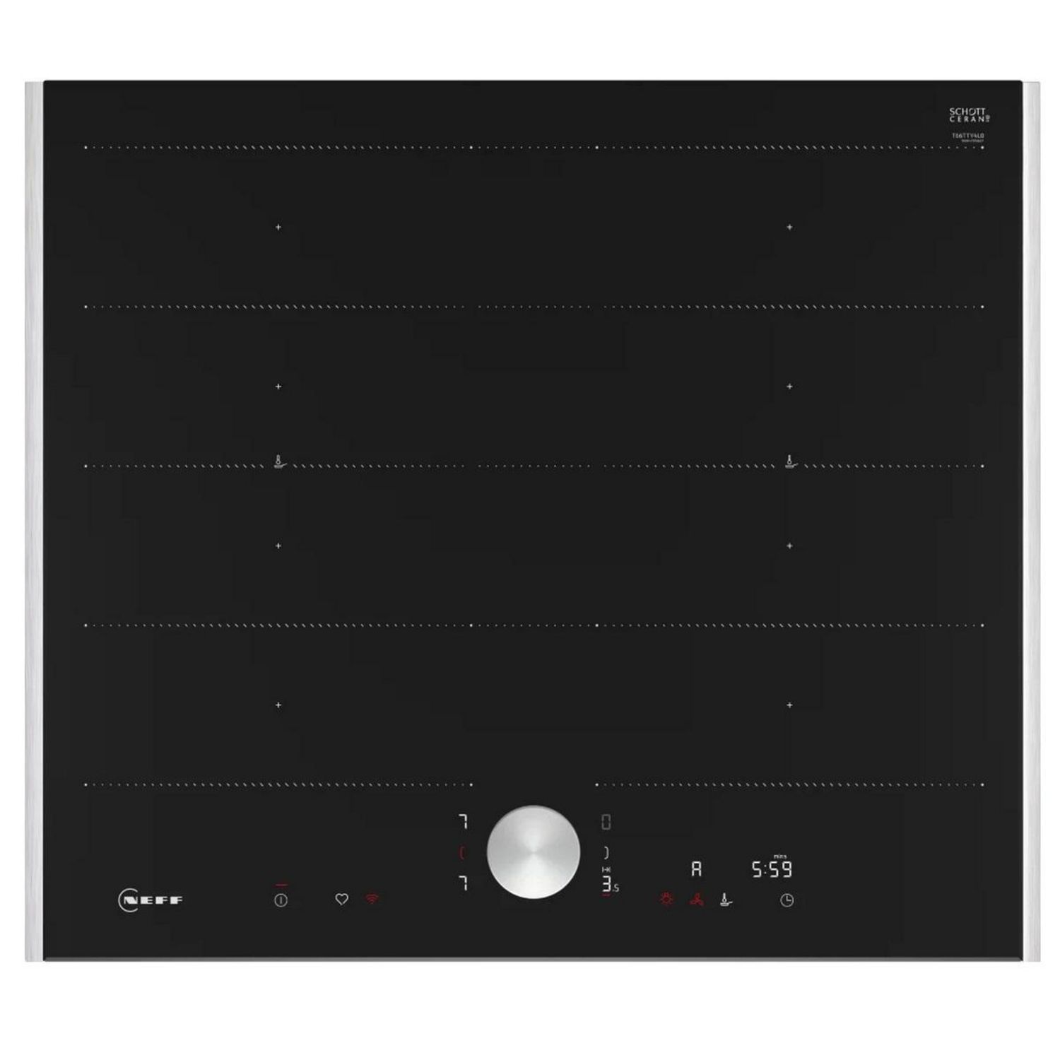 Neff T66TTY4L0 Table de cuisson à induction Flex autonome N 90 Neff T66TTY4L0 avec commande Twist Pad®. Flex Induction étendue : des zones de cuisson XXL pour vos casseroles ultra-larges. Hotte contrôlable via la table de cuisson - commande pratique de la hotte par la plaque de cuisson. Power Boost