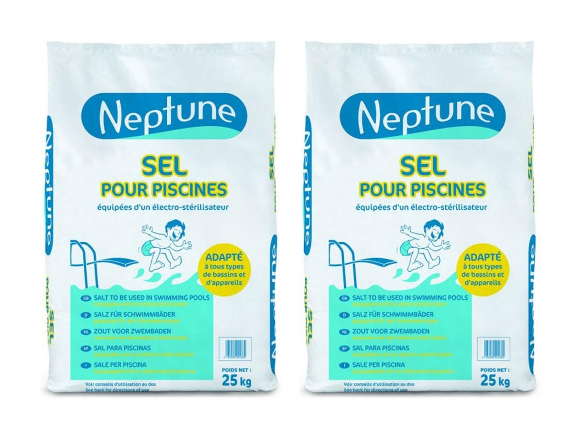 Lot de 2 sacs de 25 kg de sel pour piscine Neptune pour traitement par électrolyse. Sel pur à 99% adapté pour toutes les piscines et modèles d'électrolyseur. Traitement sans chlore, économique et écologique.