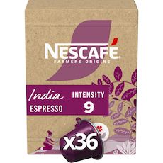 Découvrez NESCAFE Espresso India, un assemblage exceptionnel de cafés provenant de certains des meilleurs producteurs de café indiens. NESCAFE Espresso India capture toute la diversité des terres tropicales luxuriantes du sud de l'Inde, avec ses notes de cacao envoûtantes et sa torréfaction intense. Un format boîte contenant 36 capsules vous permet de préparer 36 tasses de NESCAFE Espresso India avec votre machine NESPRESSO. Intensité 9/12.