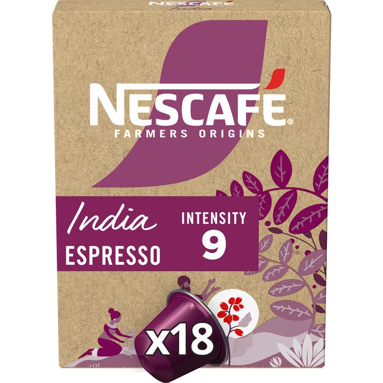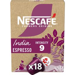 Découvrez NESCAFE Espresso India, un assemblage exceptionnel de cafés provenant de certains des meilleurs producteurs de café indiens. NESCAFE Espresso India capture toute la diversité des terres tropicales luxuriantes du sud de l'Inde, avec ses notes de cacao envoûtantes et sa torréfaction intense. Un format boîte contenant 18 capsules vous permet de préparer 18 tasses de NESCAFE Espresso India avec votre machine NESPRESSO. Intensité 9/12.