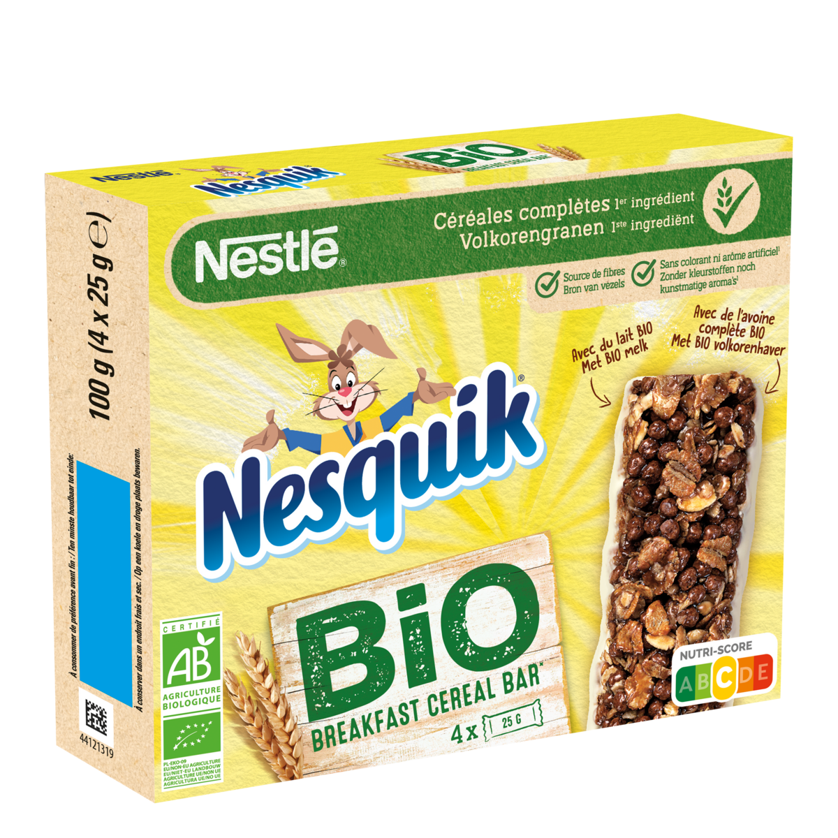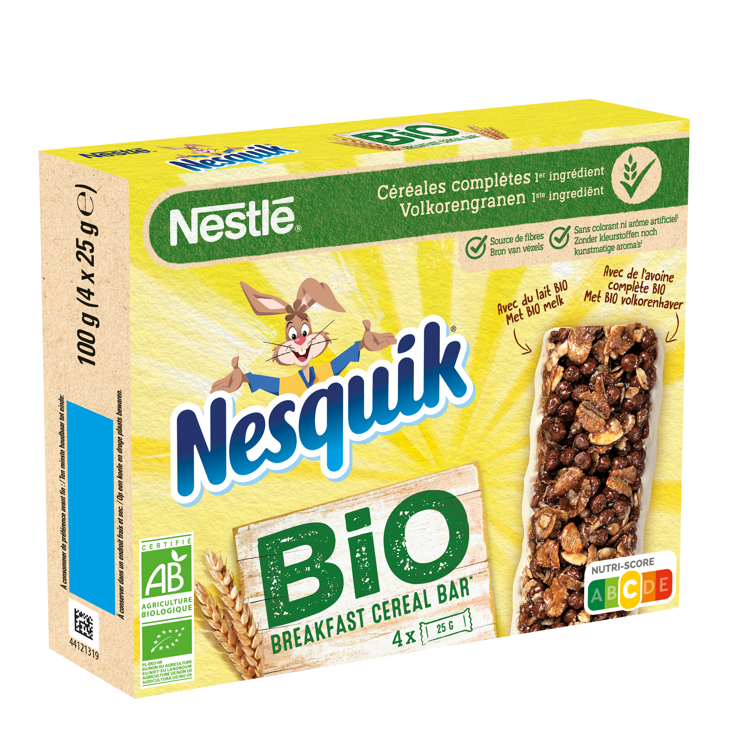 Ingrédients: Chocolat blanc* 18,0% (beurre de cacao* 6,0%, inuline [fibre]*, sucre*, LAIT entier en poudre* 2,7%, émulsifiant : lécithine de tournesol*), farine de BLE complet* 15,5%, flocons d'AVOINE complète* 14,7%, dextrose*, pétales de BLE complet* 9,8%, huile de tournesol*, sirop de glucose*, LAIT concentré sucré* 6,5% (LAIT* 3,6%, sucre*), semoule de maïs*, sucre*, cacao en poudre* 1,3%, cacao maigre en poudre* 0,5%, sel, émulsifiant : lécithine de tournesol* ; arôme naturel, antioxydant : extrait riche en tocophérols. *Ingrédients issus de l'agriculture biologique. Peut contenir du SOJA et des FRUITS A COQUE.