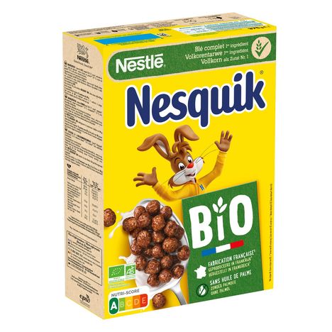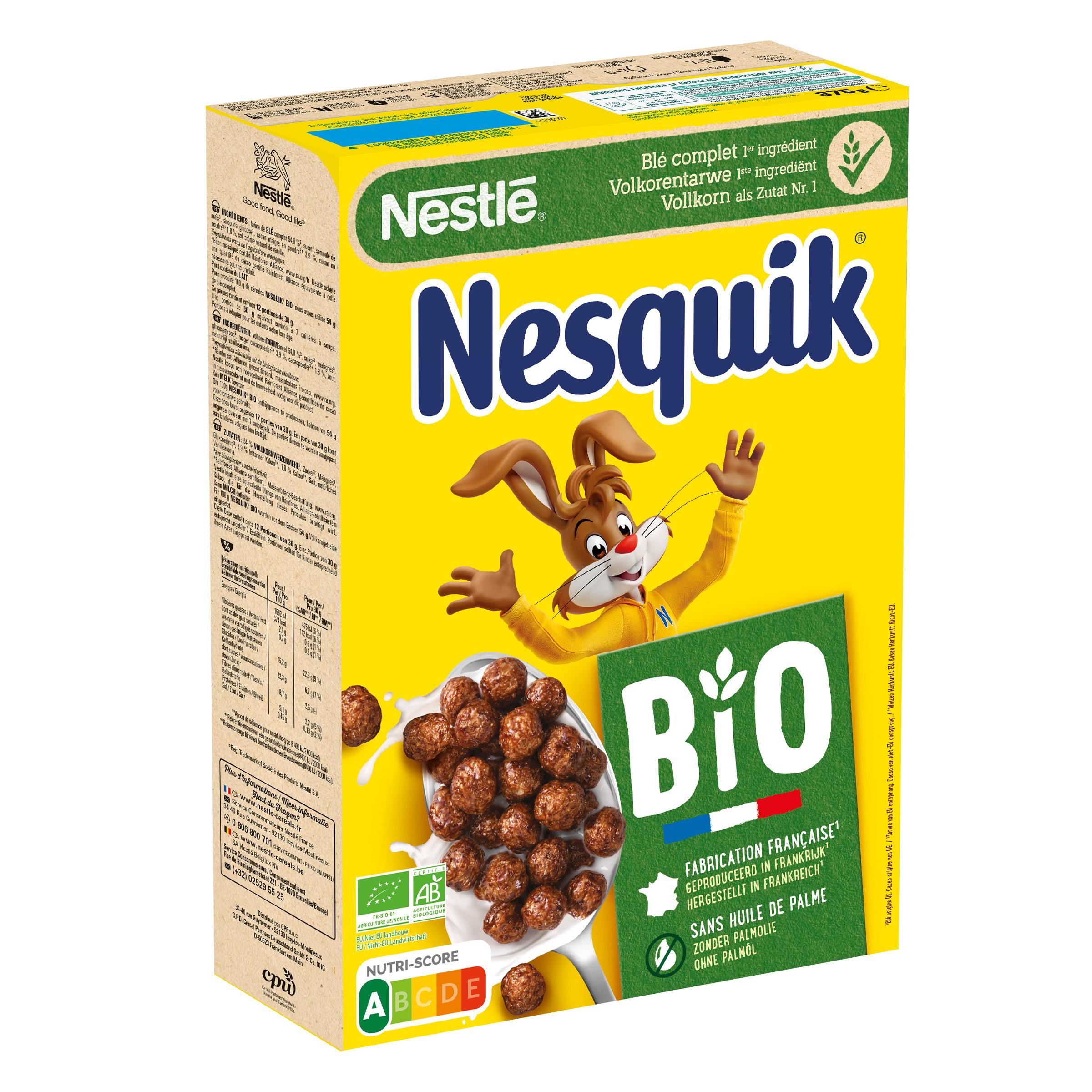 Découvrez les céréales NESQUIK® BIO dans un paquet de 375g pour le petit-déjeuner ! De délicieuses billes de céréales au chocolat, les céréales NESQUIK® BIO NESTLÉ sont composées de blé complet et sont fabriquées en France. Elles sont garanties sans huile de palme, sans colorant* ni arôme artificiel* ! Et pour varier les sensations et les plaisirs, retrouvez également en magasin les céréales CHOCAPIC® BIO, de délicieuses pétales au chocolat, les céréales CHEERIOS® BIO au bon goût de miel et les céréales Lion® BIO avec leur savoureux mélange de chocolat et de caramel. *Conformément à la réglementation sur l'agriculture biologique.