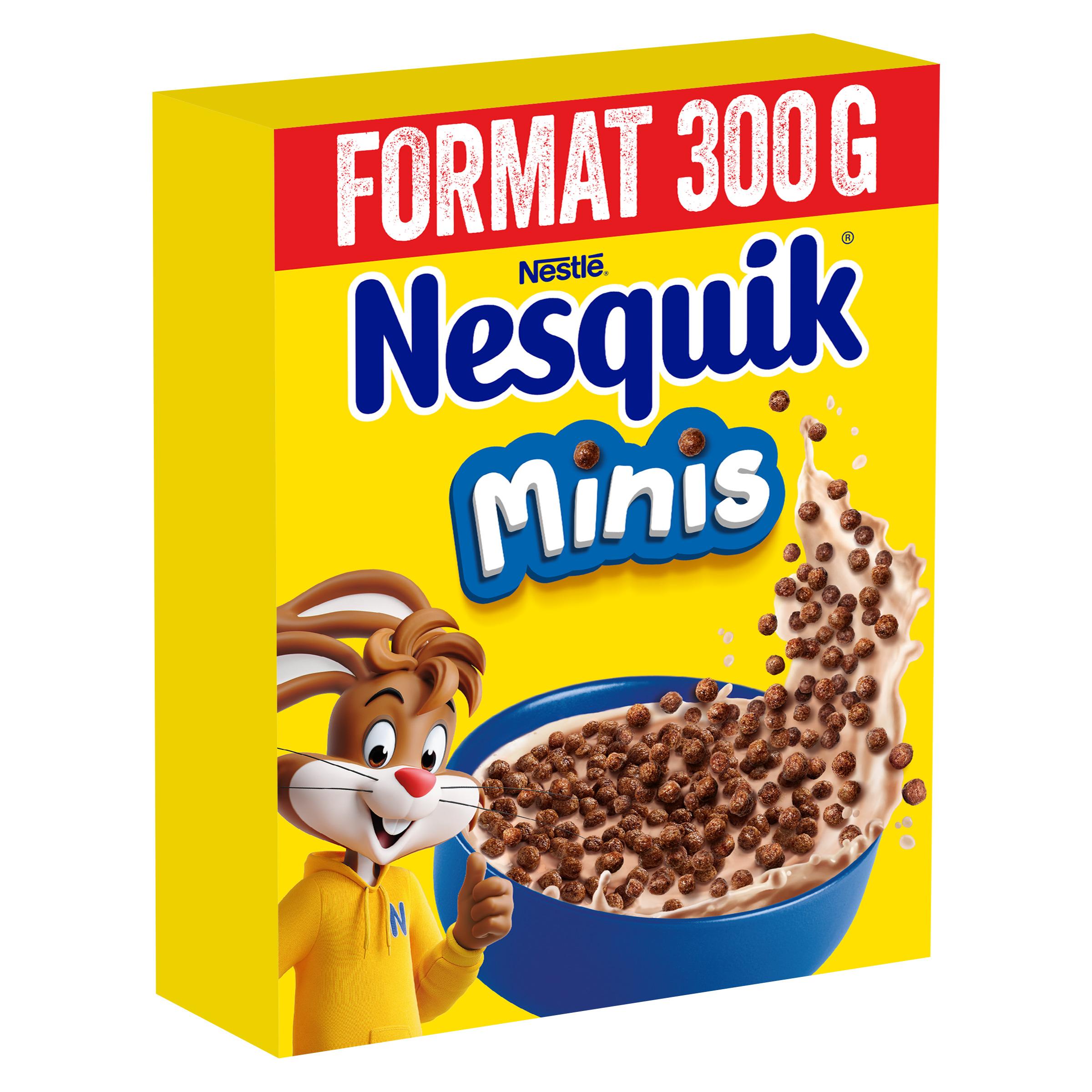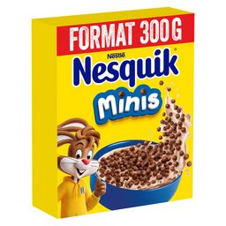 Avec NESQUIK® MINIS 300g, retrouve le goût iconique de NESQUIK® dans des mini billes de céréales croustillantes et qui donnent à ton lait un goût chocolaté savoureux. Une version mini de tes céréales NESQUIK® pour un petit-déjeuner MAXI FUN ! Avec pour premier ingrédient le blé complet, les céréales NESQUIK® MINIS sont également sources de 7 vitamines, calcium et fer et sans colorant ni arôme artificiel.