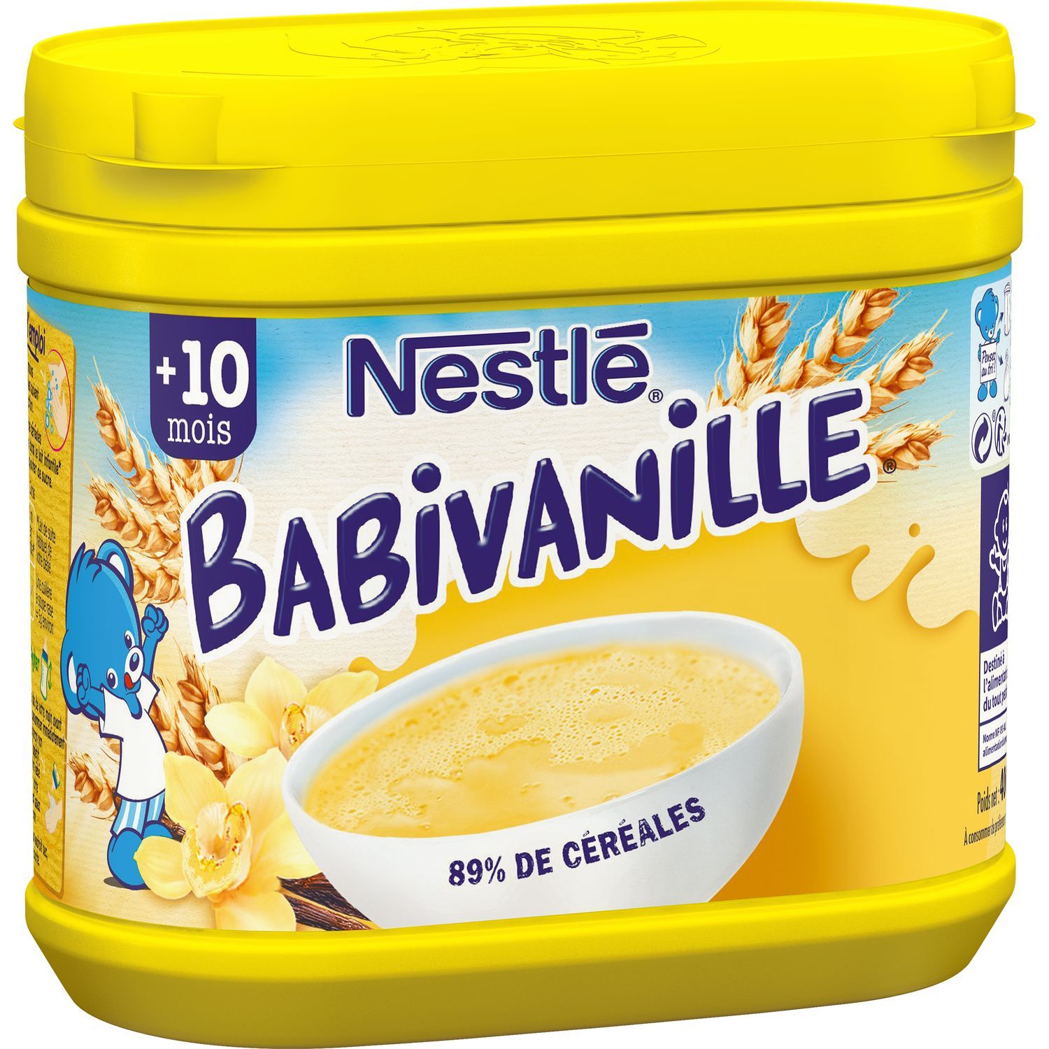 Céréales pour nourrissons et enfants en bas âge Découvrez NESTLE BABIVANILLE: une poudre exprès pour bébé* qui associée à son biberon de lait habituel, participe à un petit déjeuner gourmand et équilibré grâce à son bon goût de vanille et à son apport en céréales. Avec 89% de céréales, NESTLE BABIVANILLE est conçu spécialement pour les bébés* à partir de 10 mois. * Conformément à la réglementation sur les aliments pour bébés. Veillez à respecter l'appétit de votre enfant