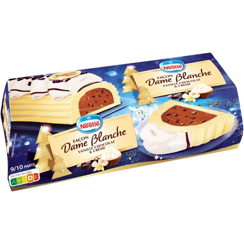 La traditionnelle Dame Blanche revisitée en bûche glacée ! L'association délicieuse de glaces parfum crème, vanille et chocolat pour un moment gourmand en famille ! Colorants et arômes d'origine naturelle.