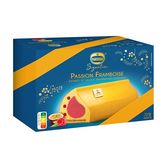 Eau, sucre, jus de fruit de la passion à base de concentré (14%), sirop de glucose, purée de framboise (9%), huile de tournesol, farine de BLÉ, arôme naturel de fruit de la passion, gélifiants (pectines, gomme Tara, gomme xanthane), émulsifiant (lécithines*), poudre de LAIT écrémé, BEURRE, acidifiant (acide citrique), jus concentré de sureau, amidon modifié, beurre de cacao, arôme naturel de framboise, colorants (caroténoïdes, rouge de betterave), matière protéique de pois hydrolysée, lactosérum (LAIT), jus concentré de framboise (0,03%), matière grasse LAITIÈRE anhydre, matière grasse LAITIÈRE, jus concentré de citron, arômes naturels de vanille, sel, ŒUF en poudre, malt d'ORGE, poudre de cacao maigre. Peut contenir : ARACHIDES, FRUITS À COQUE, SOJA, AUTRES CÉRÉALES CONTENANT DU GLUTEN et SÉSAME. * d'origine végétale. Crêpes croustillantes : 12% dans la pâte de biscuit.