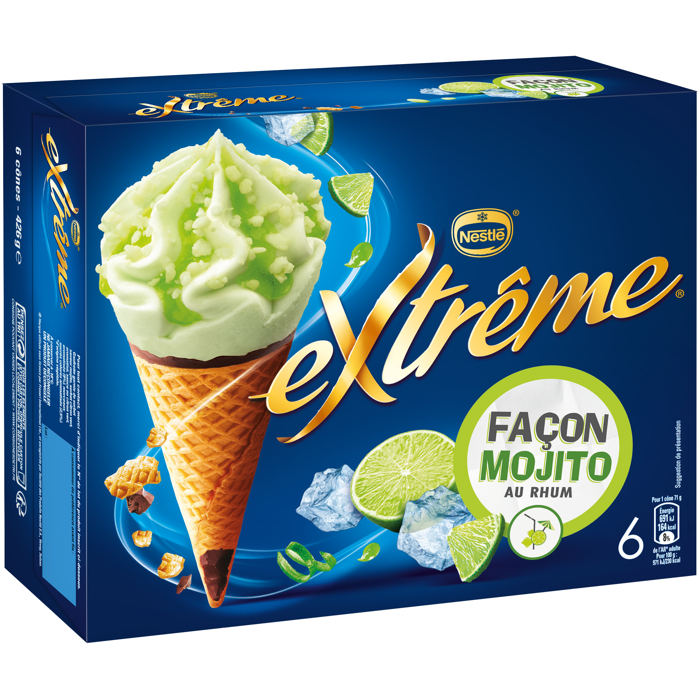 Gaufrette garnie de sorbet saveur mojito, sorbet citron vert, aromatisé, sauce au citron vert, aromatisée (8%), morceaux sucrés colorés aromatisés (2,5%). Découvrez la glace Extrême façon Mojito, la pause fraîche et intense. L'association d'un sorbet Rhum avec pointe de citron vert, d'un sorbet citron vert et d'une sauce au citron vert dans une gaufrette croustillante, et pour finir, le délicieux bonbon EXTREME pour un plaisir jusqu'au bout.