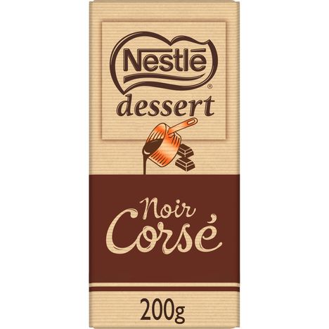 NESTLÉ DESSERT Corsé est un chocolat noir à 65% de cacao riche en arômes, intense et floral. C'est la tablette à pâtisser idéale pour donner de l'intensité à tous vos desserts ! Avec le Plan cacao, NESTLÉ DESSERT soutient les cultivateurs pour améliorer la qualité de leur cacao.