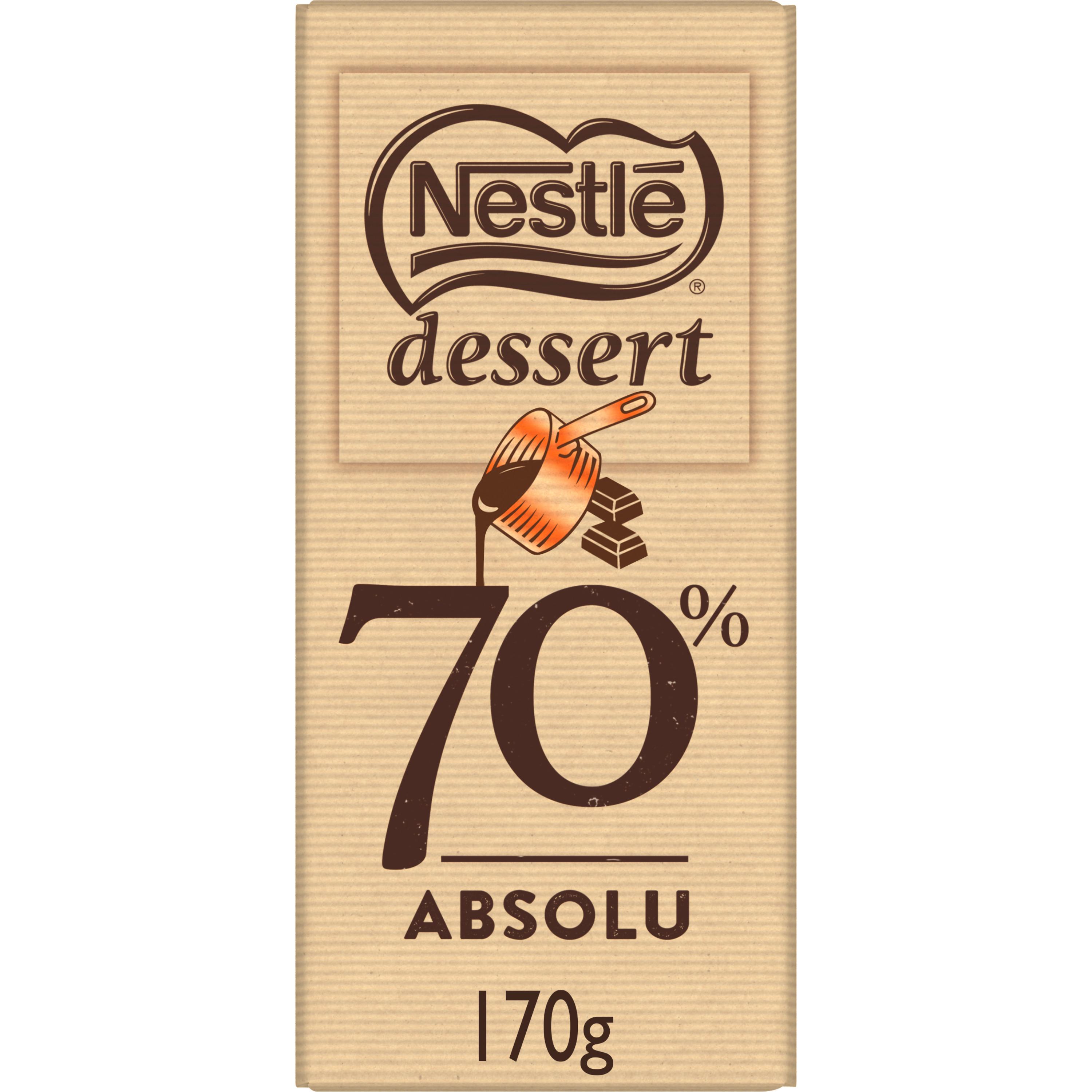 NESTLÉ DESSERT 70% Absolu est un chocolat noir à 70% de cacao aux notes fruitées et torréfiées. Avec sa fonte incomparable et son goût intense en cacao, cette tablette de chocolat à pâtisser vous assure de délicieux desserts de caractère ! Avec le Plan cacao, NESTLÉ DESSERT soutient les cultivateurs pour améliorer la qualité de leur cacao.
