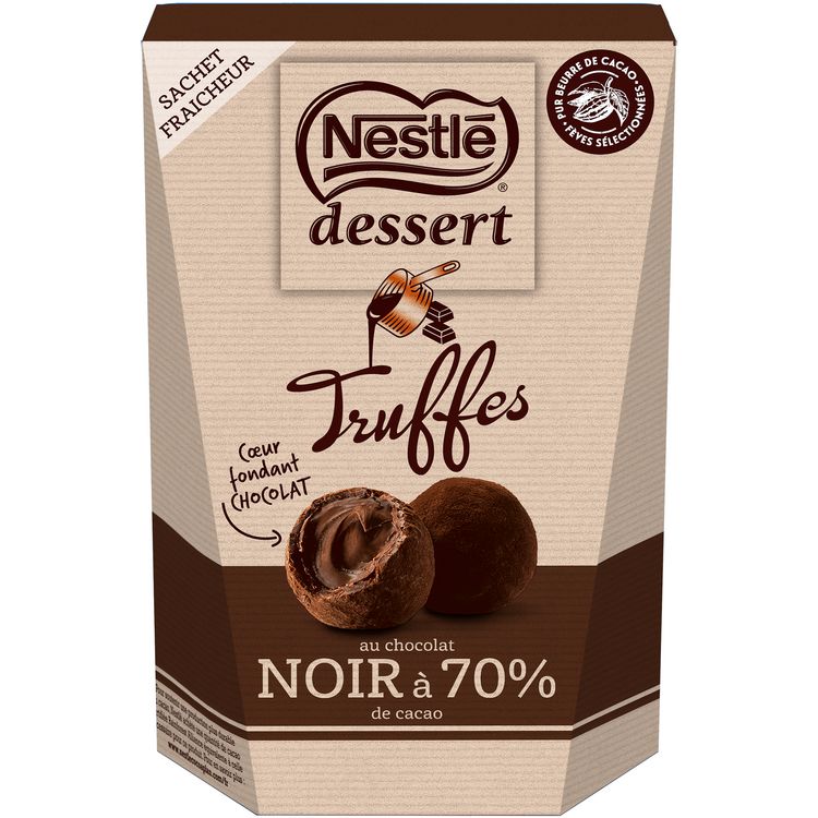 Découvrez notre gamme de truffes NESTLE DESSERT pour Noël! Laissez-vous séduire par nos Truffes cœur fondant NESTLE DESSERT au Chocolat noir corsé dans leur sachet fraicheur de 250g. Une recette intense et inimitable grâce à son chocolat pur beurre de cacao, à sa texture délicieusement fondante et des fèves de qualité soigneusement sélectionnées.
