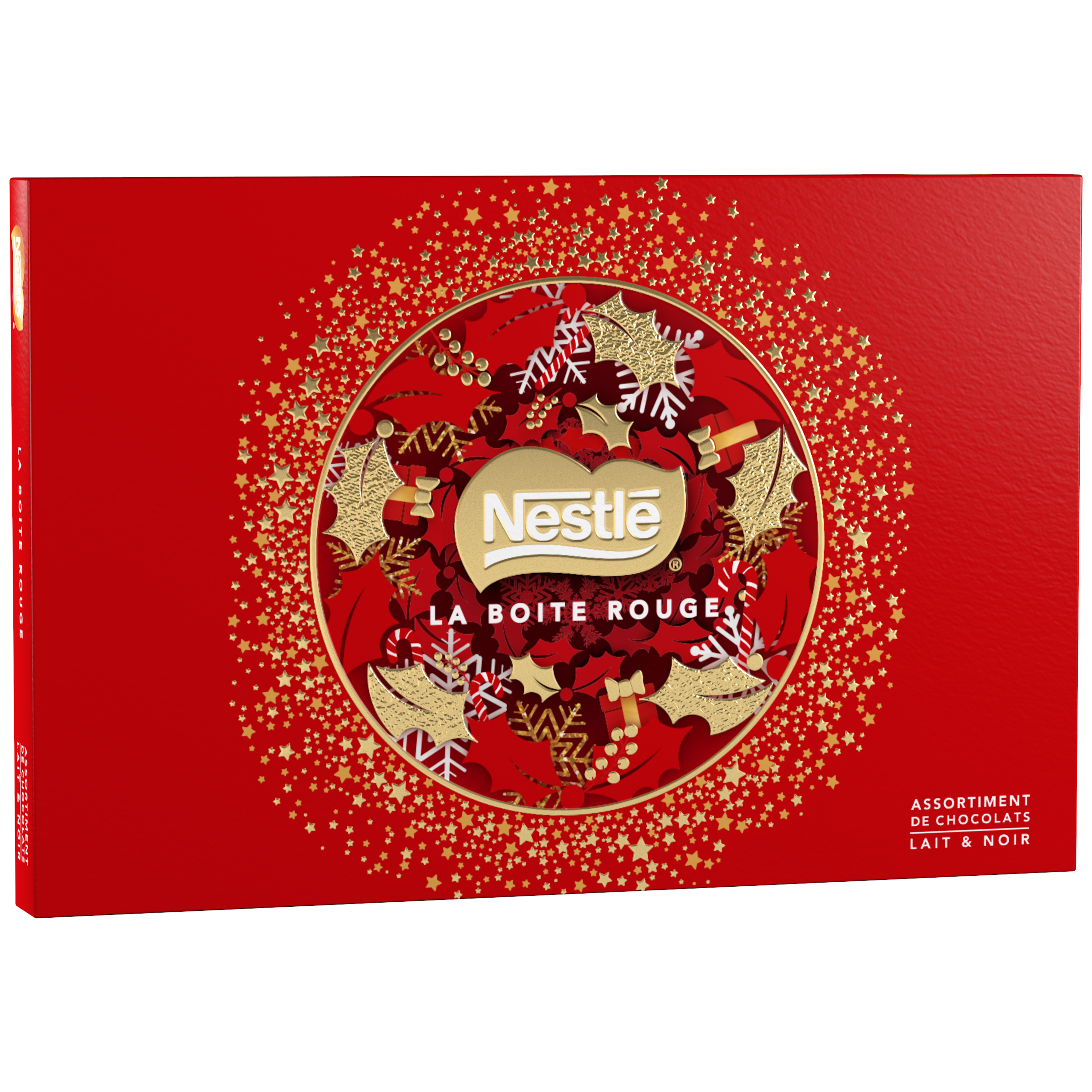 En cette période de fêtes, offrez-vous un cadeau délicieux et gourmand. La boîte rouge ! Une jolie boîte magique et gourmande, toute de rouge vêtue: rouge comme les boules de Noel, rouge comme le feu dans la cheminée, rouge comme le ruban des cadeaux ! Ouvrons-la ! Ici un bonbon au chocolat, là un fourrage gourmand, et là encore, un fondant crémeux... A chacun de savourer son chocolat avec ceux que vous aimez ! Une offre généreuse et variée de chocolats noir, blanc et au lait. Avec le Plan Cacao NESTLE, et en partenariat avec Rainforest Alliance, LA BOITE ROUGE s'engage pour une production plus durable de cacao et contribue à soutenir les cultivateurs et leurs communautés.