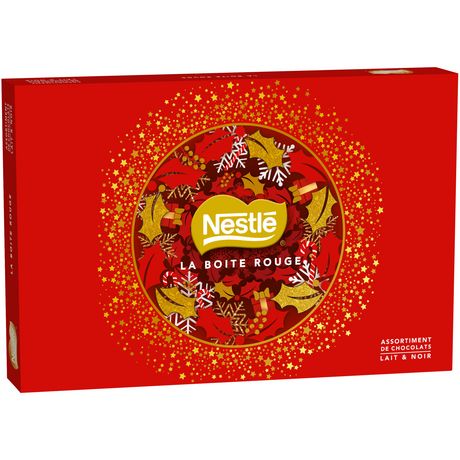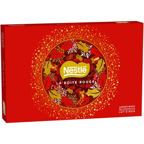 En cette période de fêtes, offrez-vous un cadeau délicieux et gourmand. La boîte rouge ! Une jolie boîte magique et gourmande, toute de rouge vêtue: rouge comme les boules de Noel, rouge comme le feu dans la cheminée, rouge comme le ruban des cadeaux ! Ouvrons-la ! Ici un bonbon au chocolat, là un fourrage gourmand, et là encore, un fondant crémeux... A chacun de savourer son chocolat avec ceux que vous aimez ! Une offre généreuse et variée de chocolats noir, blanc et au lait. NESTLE La Boite Rouge 400g