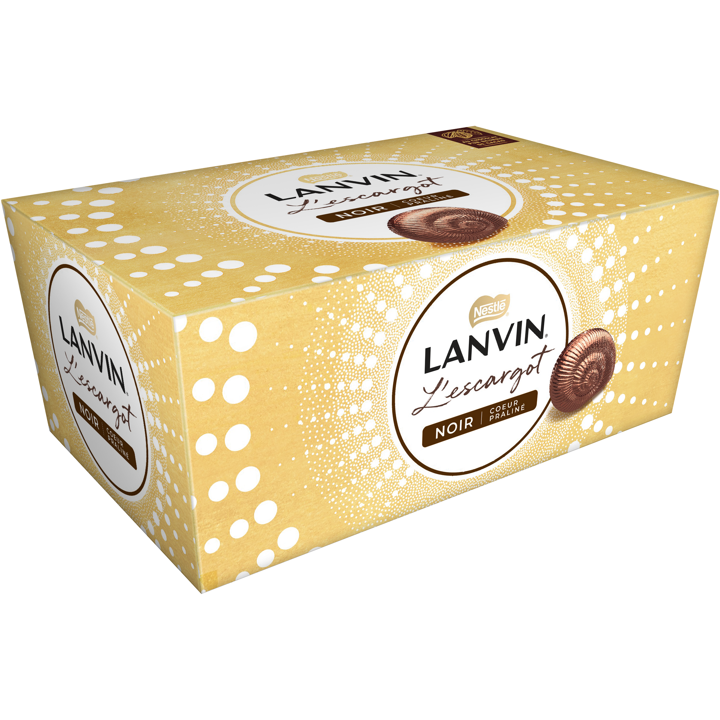 Créé en 1934 en Bourgogne, l'Escargot LANVIN vous séduira par son praliné onctueux né de la torréfaction des amandes et noisettes et par sa coque de délicieux chocolat noir et chocolat blanc. L’inimitable praliné Lanvin se dévoile… Ce praliné riche, fruité, onctueux en bouche et fondant au palais est composé d’un mélange savamment dosé d’amandes et de noisettes sélectionnées, délicatement grillées afin de sublimer les arômes en bouche… 10 bonbons de chocolat noir fourrés au praliné