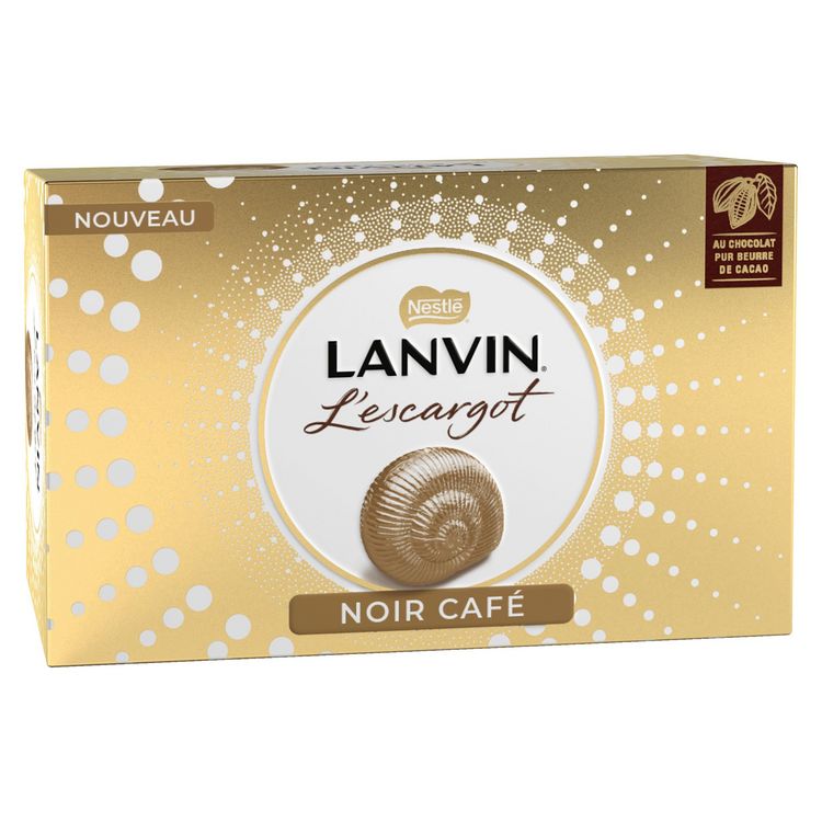 Nouveau ! Découvrez la nouvelle recette de Lanvin Escargot chocolat noir café, l'alliance subtile entre la finesse du praliné et la puissance du café. Créé en 1934 en Bourgogne, l'Escargot LANVIN vous séduira par son praliné onctueux né de la torréfaction des amandes et noisettes et par sa coque de délicieux chocolat noir. L'inimitable praliné Lanvin et l'intensité du café se dévoilent… Ce praliné riche, fruité, onctueux en bouche et fondant au palais est composé d'un mélange savamment dosé d'amandes et de noisettes sélectionnées, délicatement grillées et réhaussé d'un arôme café pour plus d'intensité… Avec le Plan Cacao NESTLE, et en partenariat avec Rainforest Alliance, LANVIN s'engage pour une production plus durable de cacao et contribue à soutenir les cultivateurs et leurs communautés.