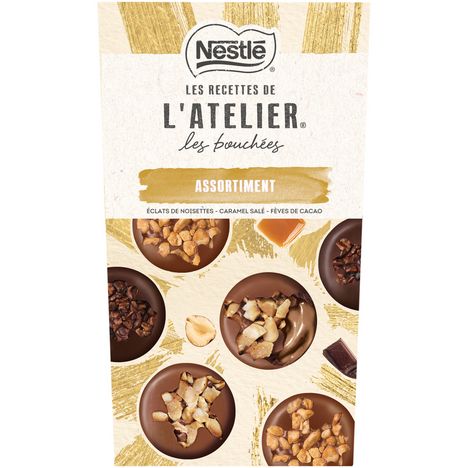 Découvrez nos délicieuses bouchées Les Recettes de l'Atelier dans ce format regroupant nos recettes Noisette / Caramel / Fèves de cacao. Un coeur fondant, une coque croquante et des éclats de fruits secs/fèves de cacao sur le dessus. Fabriquées à partir de chocolat pur beurre de cacao. Sans arômes artificiels. Un savoir-faire chocolatier unique à retrouver dans cette nouvelle boîte idéale à partager en attendant les fêtes ! Découvrez comment le Nestlé Cocoa Plan, en collaboration avec Rainforest Alliance, aide les cultivateurs de cacao à améliorer leurs pratiques agricoles. www.nestlecocoaplan.com/fr.