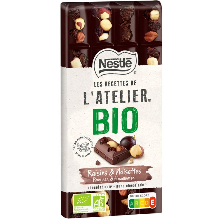 Laissez-vous tenter par nos tablettes gourmandes 100% BIO : des recettes généreuses qui vous promettent à chaque bouchée un plaisir unique. Vous ne trouverez pas deux fois le même carré dans votre tablette : chocolat noir fondant, raisins secs acidulés ou noisettes entières torréfiées.... Succombez à chacune de ces saveurs ou à leur mariage inédit pour encore plus de gourmandise. Avec le Plan Cacao NESTLE, et en partenariat avec Rainforest Alliance, NESTLE LES RECETTES DE L'ATELIER s'engage pour une production plus durable de cacao et contribue à soutenir les cultivateurs et leurs communautés.