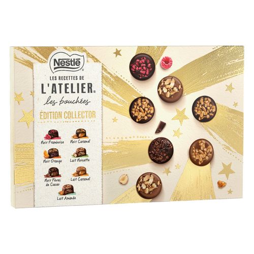 Découvrez nos délicieuses bouchées au cœur fondant et aux inclusions croquantes dans une édition collector regroupant nos 7 différentes Bouchées dont nos deux nouveautés 2025 : Lait Eclats d'Amandes et Noir Saveur Orange. Fabriquées à partir de chocolat pur beurre de cacao. Sans arômes artificiels. Un savoir-faire chocolatier unique à retrouver dans cet assortiment de six bouchées gourmandes enrobées soit de chocolat au lait soit de chocolat noir. Contient : Bouchées Eclats de Noisette, Bouchées Fèves de Cacao au chocolat noir, Bouchées Caramel Salé au chocolat noir, Bouchées Caramel Salé au chocolat au lait, Bouchées Framboise au chocolat noir, Bouchées Lait Eclats d'Amandes et Bouchées Noir Saveur Orange. Avec le Plan Cacao NESTLE, et en partenariat avec Rainforest Alliance, LES RECETTES DE L'ATELIER s'engage pour une production plus durable de cacao et contribue à soutenir les cultivateurs et leurs communautés.www.nestlecocoaplan.com/fr.