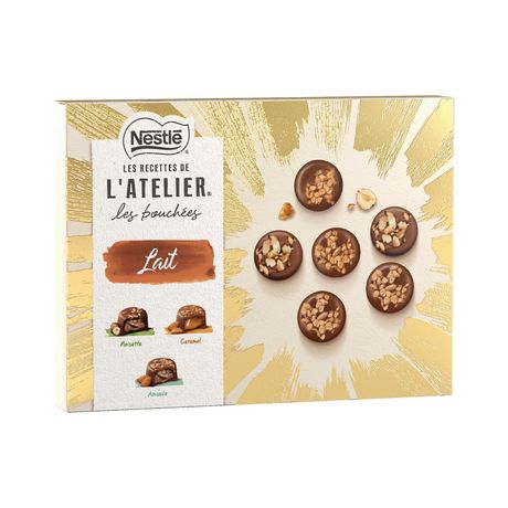 Découvrez nos délicieuses bouchées au cœur fondant et aux inclusions croquantes. Fabriquées à partir de chocolat pur beurre de cacao. Sans arômes artificiels. Un savoir-faire chocolatier unique à retrouver dans cet assortiment de trois bouchées gourmandes enrobées d'un doux chocolat au lait. Contient : Bouchées Eclats de Noisette, Bouchées Caramel Salé et NOUVEAU : Bouchée Eclats d'Amandes! Avec le Plan Cacao NESTLE, et en partenariat avec Rainforest Alliance, LES RECETTES DE L'ATELIER s'engage pour une production plus durable de cacao et contribue à soutenir les cultivateurs et leurs communautés.www.nestlecocoaplan.com/fr.