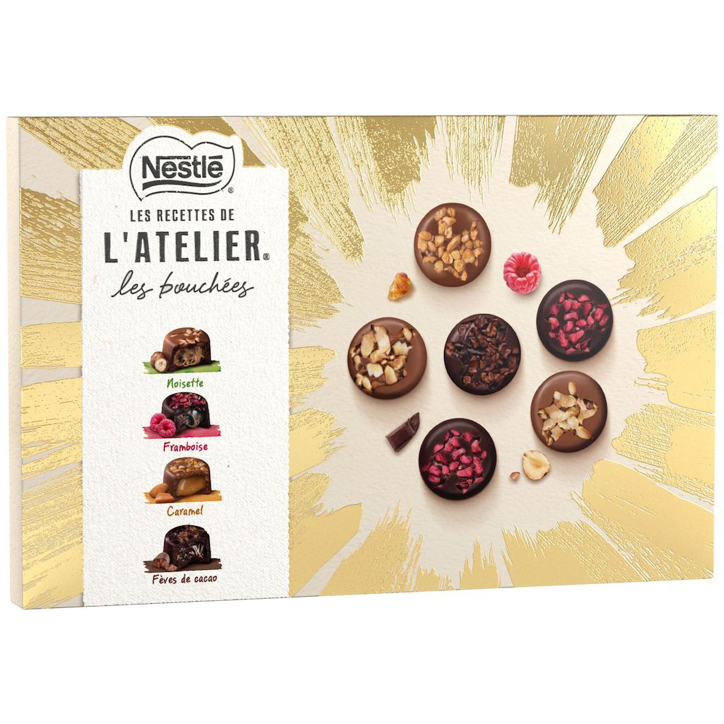 Découvrez nos délicieuses bouchées au cœur fondant et aux inclusions croquantes. Fabriquées à partir de chocolat pur beurre de cacao. Sans arômes artificiels. Un savoir-faire chocolatier unique à retrouver dans cet assortiment de bouchées gourmandes: Eclats de noisettes, caramel salé, fèves de cacao et framboise intense. Contient : Bouchées Eclats de Noisette, Bouchées Fèves de Cacao, Bouchées Caramel Salé, Bouchées Framboise Intense. Avec le Plan Cacao NESTLE, et en partenariat avec Rainforest Alliance, LES RECETTES DE L'ATELIER s'engage pour une production plus durable de cacao et contribue à soutenir les cultivateurs et leurs communautés.