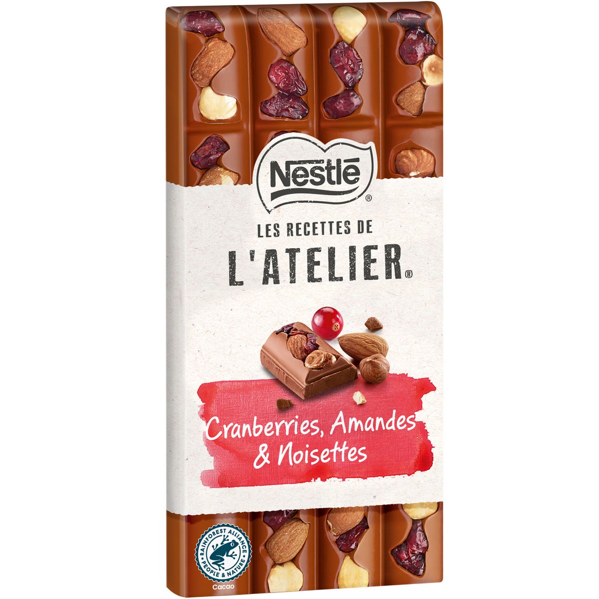 Ingrédients : sucre, beurre de cacao¹, LAIT entier en poudre, pâte de cacao¹ (Afrique de l'Ouest), cranberries confites (7,6%) (cranberries, sucre), LAIT écrémé en poudre, AMANDES torréfiées (5,2%), NOISETTES torréfiées (5,2%), émulsifiant (lécithines), arôme naturel. Cacao : 30% minimum. Peut contenir : ŒUF, GLUTEN, autres FRUITS À COQUE. ¹Bilan massique certifié Rainforest Alliance. www.ra.org/fr.