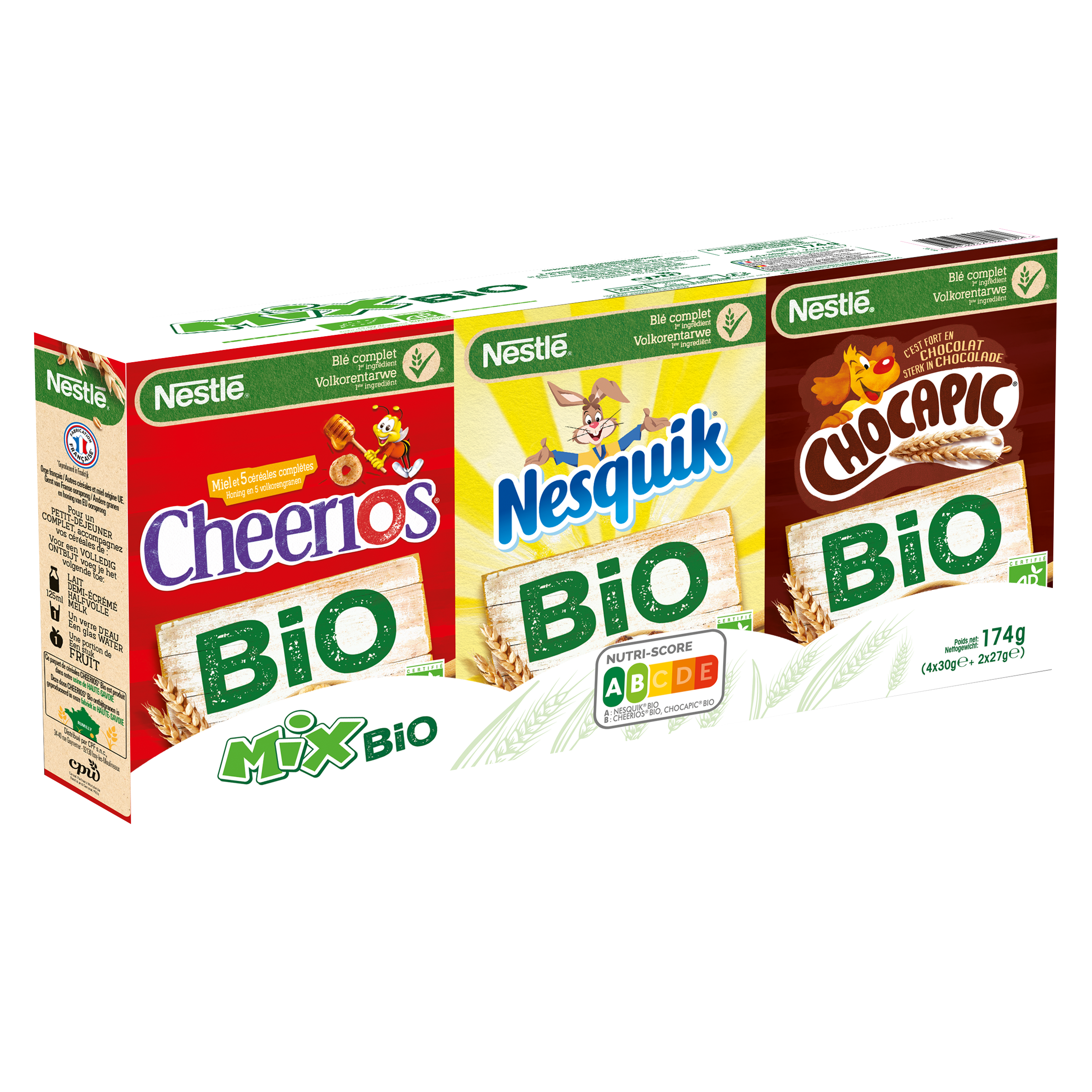 Céréales prêtes à consommer biologiques Retrouvez vos céréales NESTLE Bio, NUTRISCORE B, sans huile de palme et fabriquées en France, dans le NESTLE Mix Bio. Cheerios Bio : des céréales complètes au délicieux goût de miel ; Chocapic Bio au bon goût de Chocapic ; Nesquik Bio : de délicieuses billes de céréales complètes croustillantes au cacao. La portion parfaite pour le petit déjeuner, des recettes miel et chocolat pour varier les plaisirs, et un format facile à emporter partout avec vous. Pour un petit-déjeuner complet, accompagnez vos céréales de 125ml de lait demi-écrémé et d'un fruit frais ( 1 des 5 portions recommandées par jour).