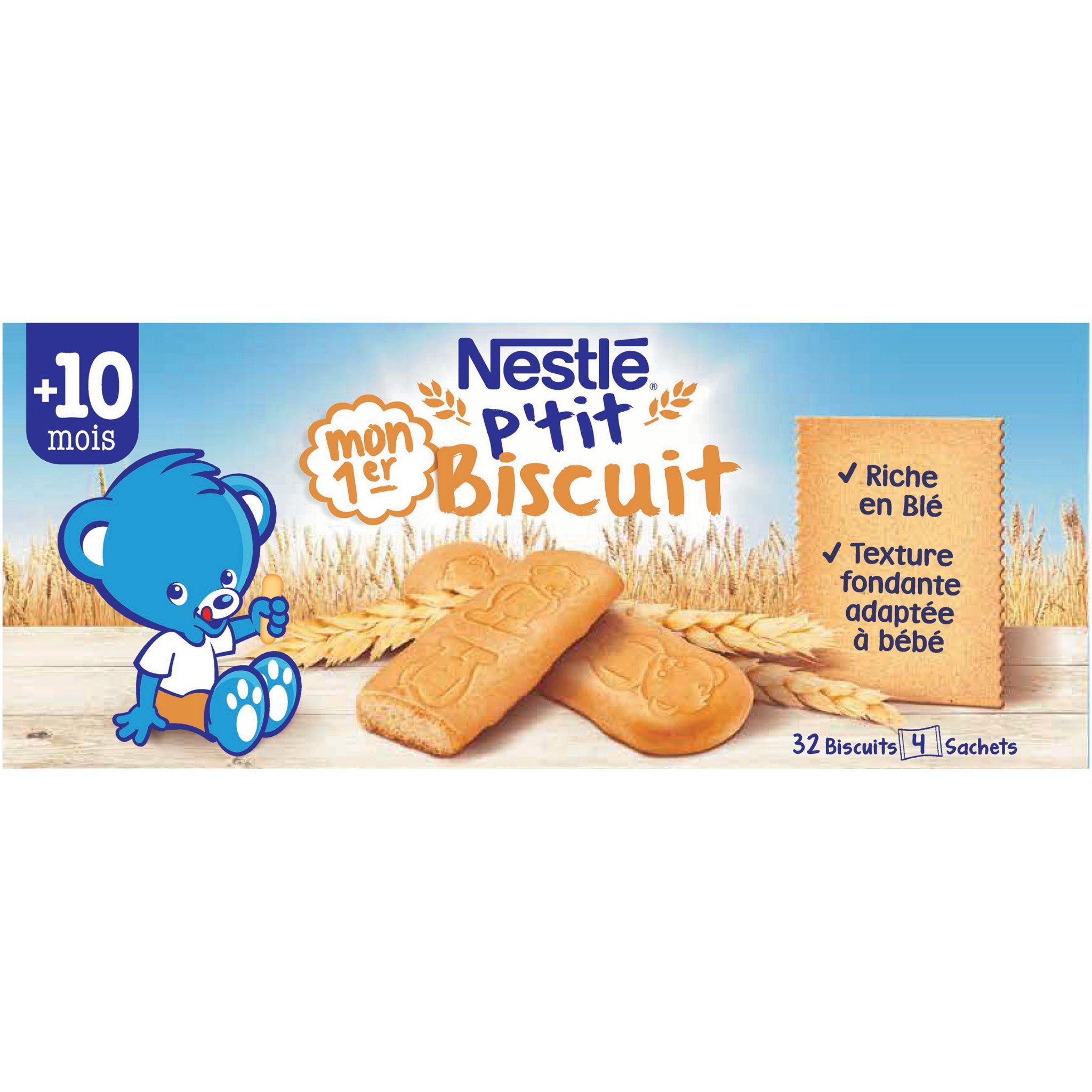 NESTLE MON 1ER P'TIT BISCUIT : un biscuit riche en blé qui offre à bébé un goûter complet et équilibré, en complément de son lait habituel. Veillez à respecter l'appétit de Bébé. Pratique: Ouverture et fermeture faciles avec 4 sachets pour une conservation optimisée. Bébé est-il prêt ? Vous pouvez donner Mon 1er P'tit Biscuit à votre bébé : s'il se tient maintenant assis tout seul dans sa chaise; s'il a déjà 2 dents; s'il mange déjà des plats avec des petits morceaux; s'il mange déjà du pain. C'est toujours assis bien droit et sous la surveillance permanente d'un adulte que votre bébé peut savourer son P'tit Biscuit. Biscuit pour bébés