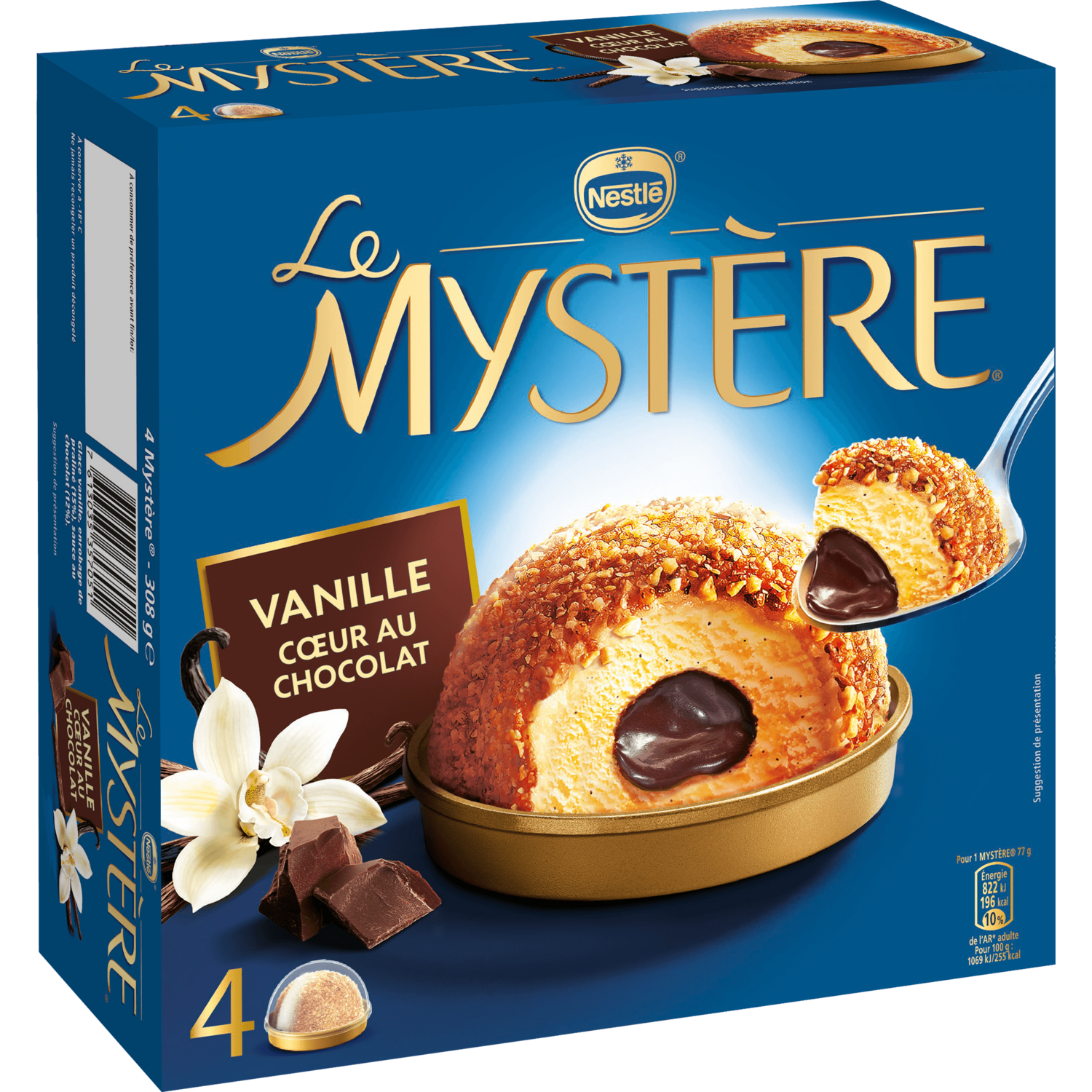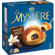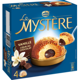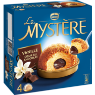 Glace vanille, enrobage de praliné (16%) sauce au chocolat (12%). Découvrez le Mystère Vanille avec son cœur chocolat fondant. L'alliance d'un crème glacée vanille avec une sauce fondante au chocolat au cœur et un enrobage craquant de praliné. Un dessert gourmand pour finir le repas en beauté !