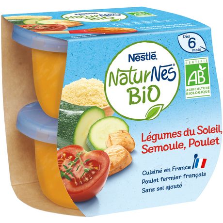 NATURNES BIO, c'est toute l'expertise de NESTLE avec des ingrédients agricoles issus de l'agriculture biologique. Rigoureusement sélectionné, le poulet fermier est 100% français et la variété de nos légumes est choisie pour leur goût. Chaque famille d'ingrédients est cuite séparément et doucement pour préserver le bon goût de la nature. Tous nos petits pots sont élaborés en France dans les Vosges.