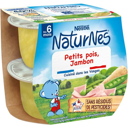 NATURNES sélectionne avec soin de bons ingrédients 100% d'origine naturelle et en préserve les goûts grâce à un mode de cuisson à la vapeur douce. Rigoureusement sélectionnés, notre porc est 100% français et nos légumes sont choisis pour leur goût. Chaque famille d'ingrédients est cuite séparément pour préserver les saveurs et tous nos petits pots sont élaborés en France dans les Vosges. Purée de légumes et de viande avec arôme naturel adaptée à bébé