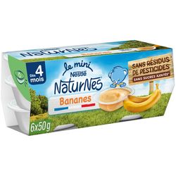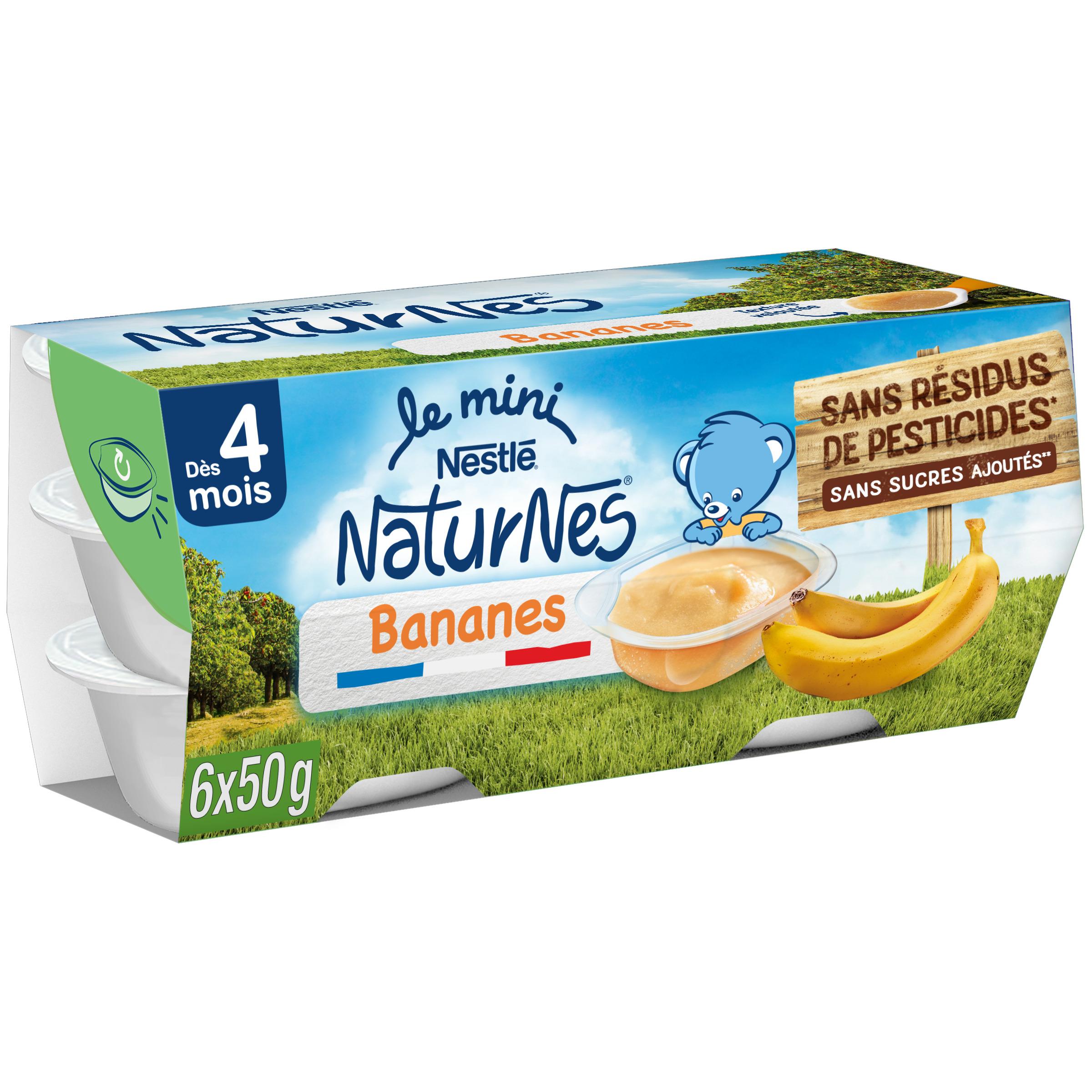 NATURNES Mini, un format inédit pour faire découvrir à bébé le bon goût de la nature, en sélectionnant des fruits à maturité, puis en préservant leur goût grâce à un mode de cuisson douce. Ainsi NATURNES accompagne bébé dès ses premières cuillères avec des recettes simples mono-fruits, dans un format 50g adaptable à son appétit. Nos petits pots sont tous élaborés en France, dans les Vosges. Entre 4 et 6 mois, demandez conseil à votre médecin pour bien démarrer la diversification. Bananes d'origine UE