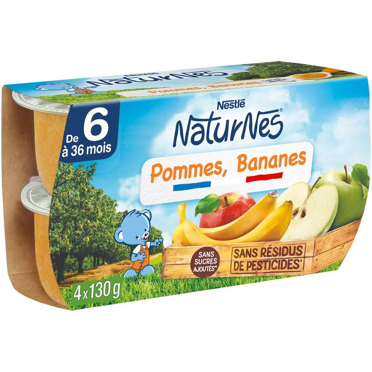 NaturNes® contribue à prendre soin de ce que nous offre la nature afin de le donner à bébé, en sélectionnant de bons fruits à maturité, puis en en préservant leur goût grâce à un mode de cuisson douce. Ainsi bébé découvre le bon goût de la nature dans chaque cuillère de nos petits pots, tous élaborés en France, dans les Vosges. Entre 4 et 6 mois, demandez conseil à votre médecin pour bien démarrer la diversification. Pommes origine UE. Bananes origine non UE.