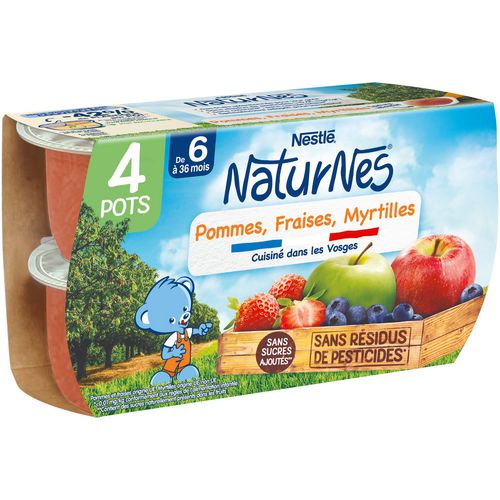 NaturNes® contribue à prendre soin de ce que nous offre la nature afin de le donner à bébé, en sélectionnant de bons fruits à maturité, puis en en préservant leur goût grâce à un mode de cuisson douce unique. Ainsi bébé découvre le bon goût de la nature dans chaque cuillère de nos petits pots, tous élaborés en France, dans les Vosges. Entre 4 et 6 mois, demandez conseil à votre médecin pour bien démarrer la$ diversification. Ensemble participons à la transition écologique : nous avons retiré les couvercles de nos pots afin de réduire de 42% le plastique par pot* ! *Calculé sur le poids du pot avec son couvercle.Pommes, fraises UE. Myrtilles origine UE / non UE.