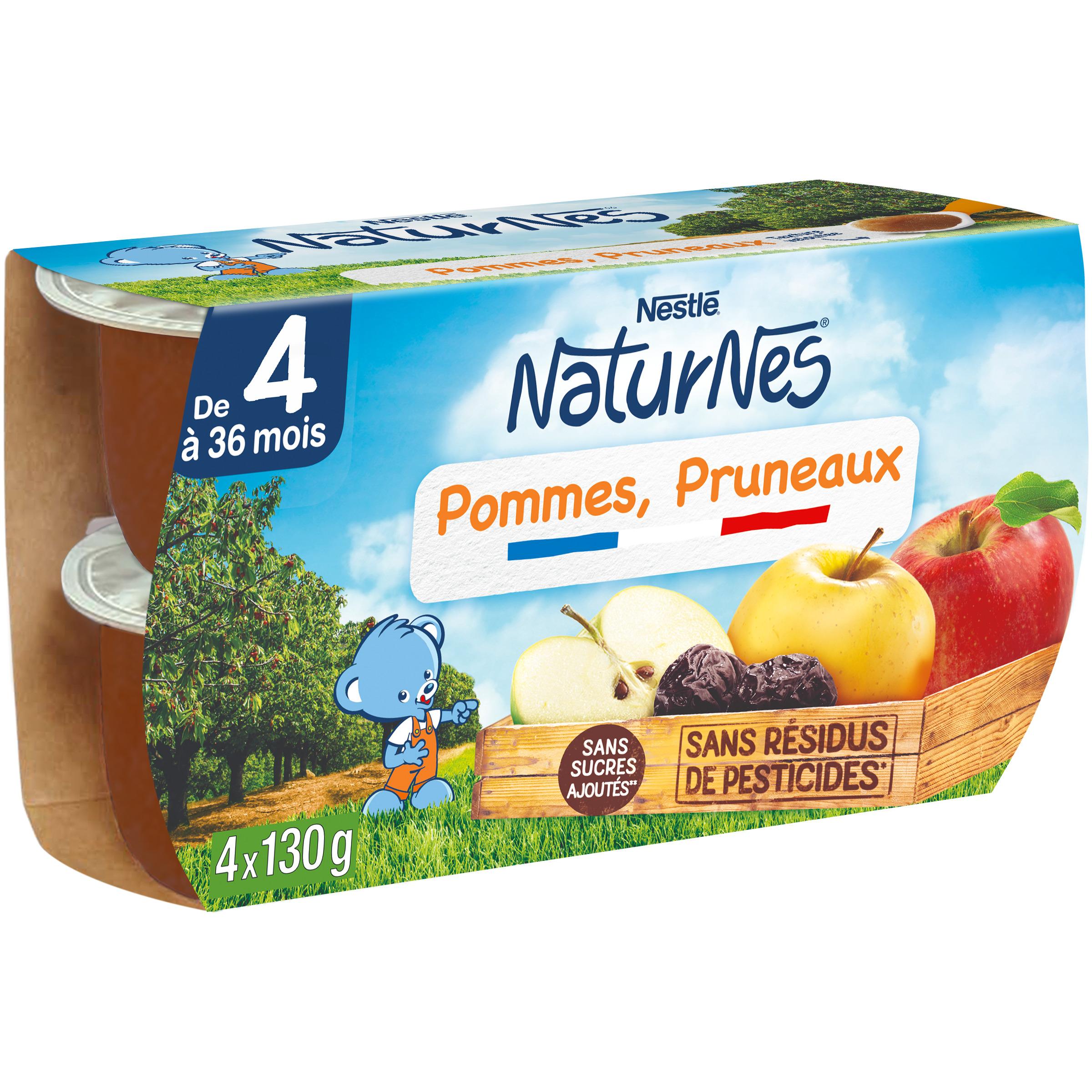 NaturNes® contribue à prendre soin de ce que nous offre la nature afin de le donner à bébé, en sélectionnant de bons fruits à maturité, puis en en préservant leur goût grâce à un mode de cuisson douce unique. Ainsi bébé découvre le bon goût de la nature dans chaque cuillère de nos petits pots, tous élaborés en France, dans les Vosges. Entre 4 et 6 mois, demandez conseil à votre médecin pour bien démarrer la diversification. Ensemble participons à la transition écologique : nous avons retiré les couvercles de nos pots afin de réduire de 42% le plastique par pot* ! *Calculé sur le poids du pot avec son couvercle.Pommes et pruneaux origine UE.