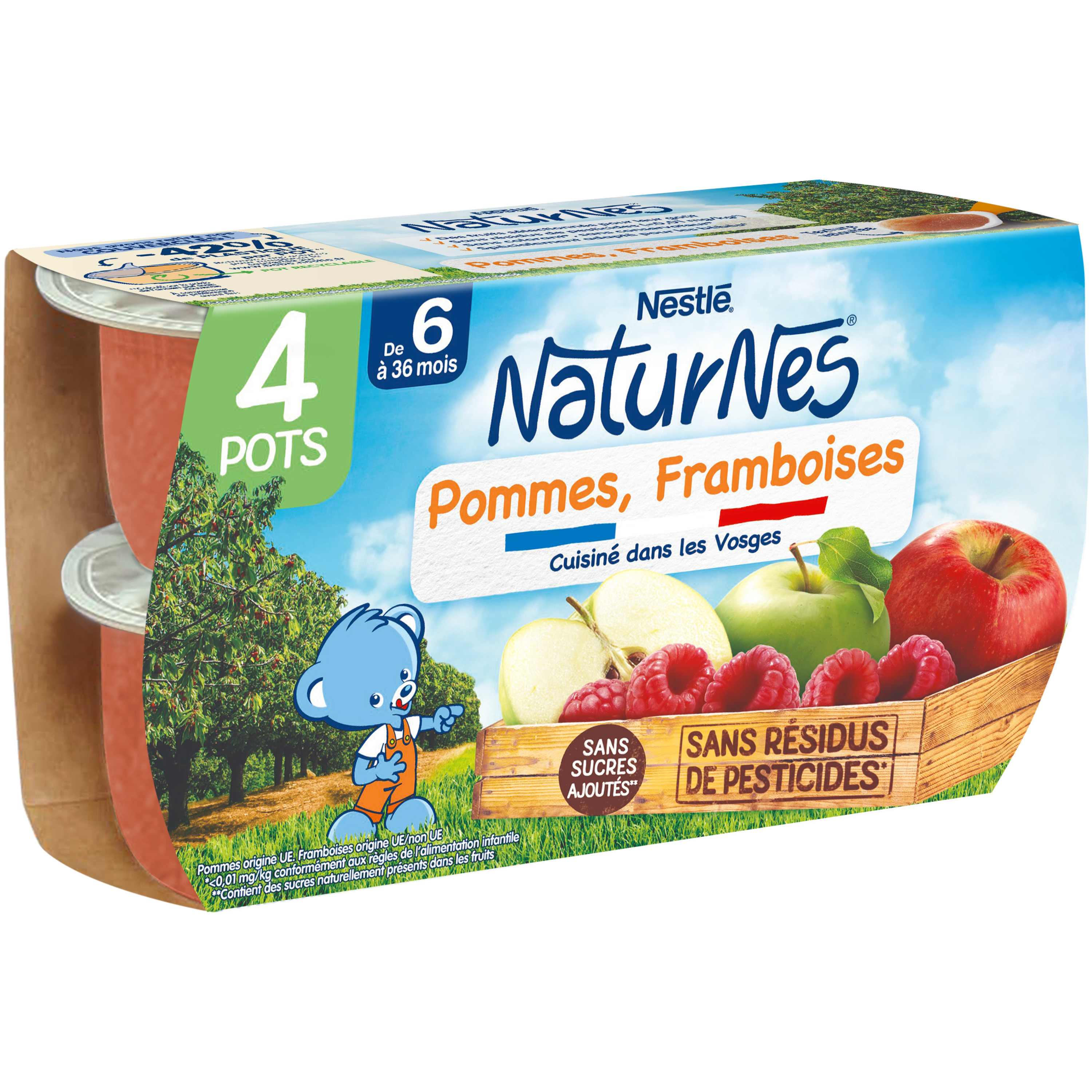 NATURNES prend soin de ce que nous offre la nature afin de le donner à bébé. C'est pourquoi NATURNES sélectionne de bons fruits à maturité, en préserve le goût grâce à son mode de cuisson douce. Ainsi bébé découvre le bon goût de la nature dans chaque cuillère. Tous nos petits pots sont élaborés en France dans les Vosges. Purée de fruits adaptée à bébé