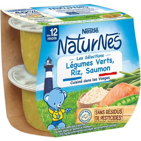 Dans sa gamme « Les Sélections », NATURNES choisit avec rigueur l’origine de ses viandes et de ses poissons : 100% des viandes sont d’origine française et 100% des poissons sont sauvages. De plus, tous les petits pots NATURNES sont préparés en France, dans les Vosges, avec des ingrédients 100% d’origine naturelle. Purée à base de légumes et de poisson adaptée à bébé