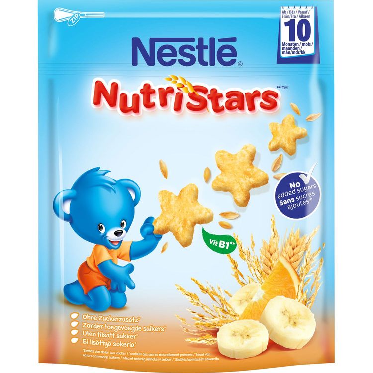 NESTLE NUTRISTARS dès 10 mois : Un encas délicieux qui aide bébé à manger de manière autonome. Important : Votre bébé doit être habitué à mâcher des aliments solides. Surveillez votre bébé lorsqu'il mange. Prenez soin de donner NutriStars à votre bébé lorsqu'il est en position assise. Sachet refermable. Préparation à base de céréales pour bébé.