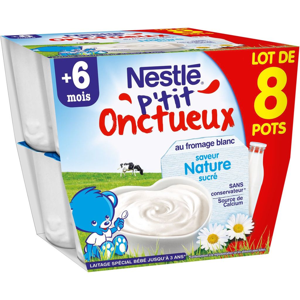 NESTLE P'TIT ONCTUEUX au fromage blanc, le laitage onctueux conçu spécialement pour bébé* produit en France ! Source de calcium et une teneur ajustée en protéines*. Pratique, il s'emporte partout grâce à notre procédé de fabrication spécifique qui permet une conservation hors du frigo. *Conformément à la réglementation sur les aliments pour bébés. Aliment pour bébés. Dessert lacté avec arôme naturel.