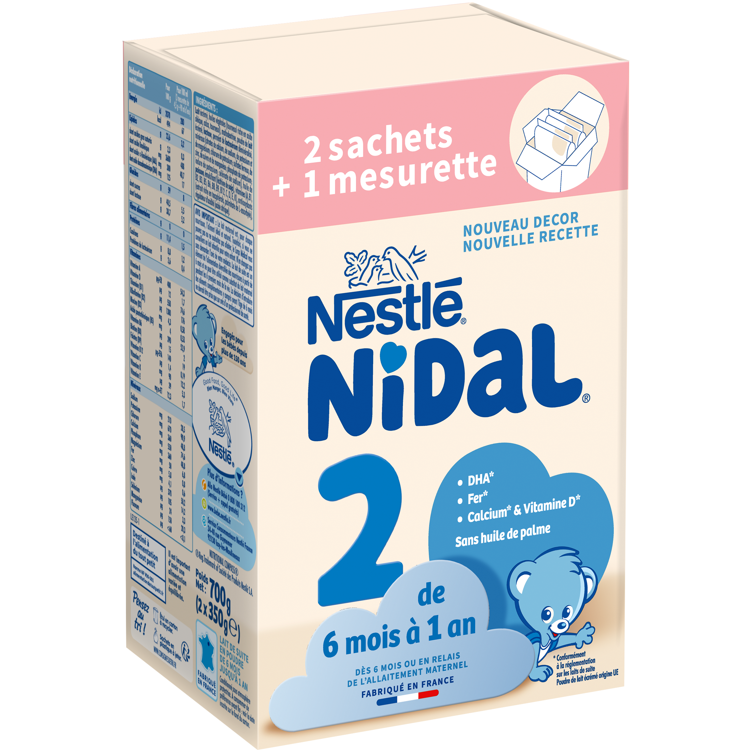 Lait de suite en poudre de 6 mois jusqu'à 1 an NESTLE NIDAL 2 de 6 mois à 1 an répond aux besoins nutritionnels* de votre bébé de 6 mois à 1 an dans le cadre d'une alimentation diversifiée avec notamment : - Des acides gras polyinsaturés de la famille des Oméga-3 : du DHA*, acide docosahexaénoïque (issu de l'huile de poisson), et de l’acide alpha-linolénique* qui contribue au développement normal du cerveau. - Du fer* qui contribue au fonctionnement normal du système immunitaire. - Du calcium* et de la vitamine D* qui contribuent au développement normal des os et des dents.*Conformément à la réglementation sur les laits de suite