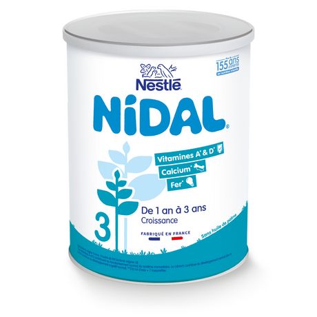 NESTLE NIDAL Croissance dès 1 an. Jusqu'à ses 3 ans, votre bébé vit une période de croissance et de progrès extraordinaires. Dans le cadre d'une alimentation diversifiée et pour répondre à ses besoins spécifiques NESTLE NIDAL Croissance dès 1 an contient : Du fer qui contribue au développement cognitif normal. Des vitamines A & D qui contribuent au fonctionnement normal du système immunitaire. Du calcium qui contribue au développement normal des os.
