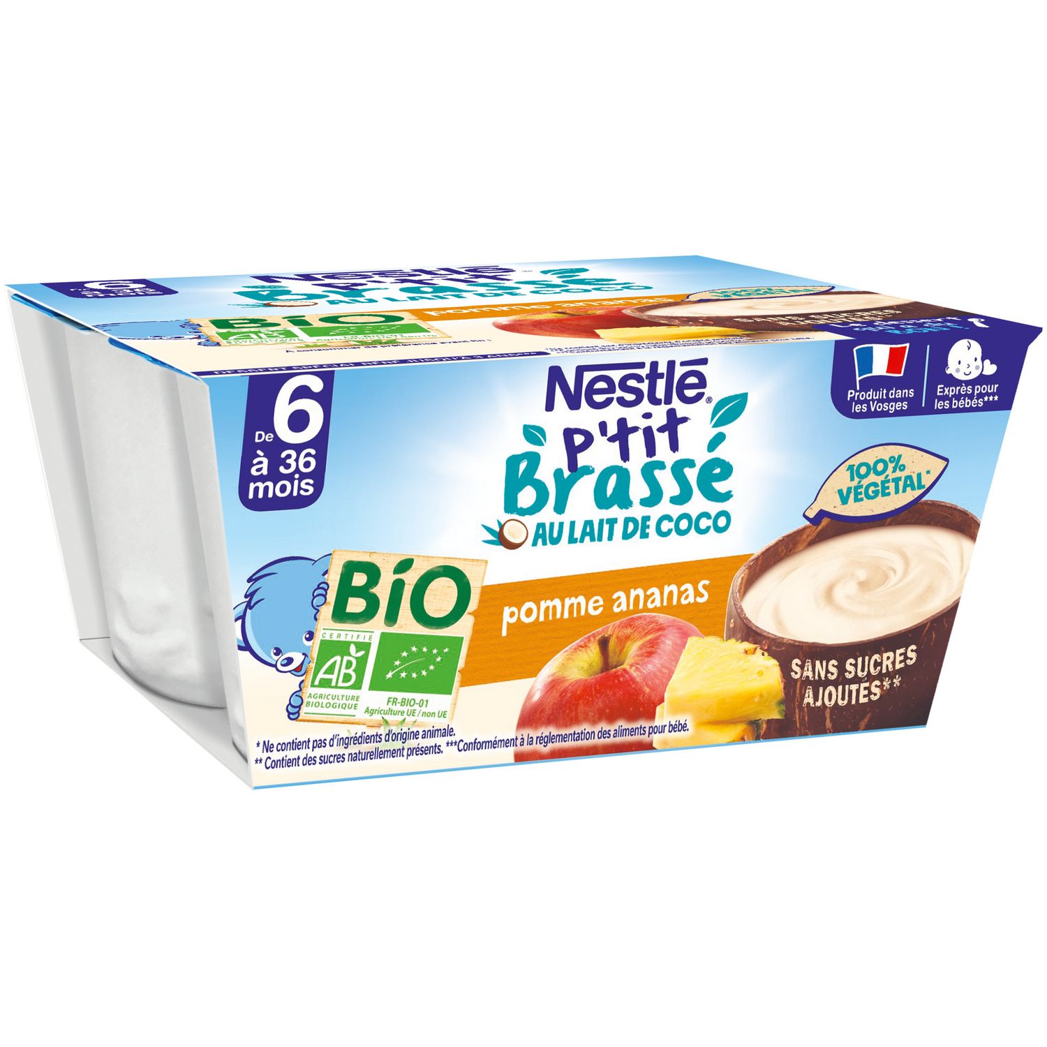 NESTLE P'tit Brassé BIO au lait de coco, le premier P’tit Brassé 100% végétal(1) conçu exprès pour bébé(2), sans sucres ajoutés(3) et produit en France ! Pratique, il s'emporte partout grâce à notre procédé de fabrication spécifique qui permet une conservation hors du frigo. (1) Ne contient pas d’ingrédients d’origine animale. (2)Conformément à la réglementation sur les aliments pour bébés. (3) Contient des sucres naturellement présents. Aliment biologique pour bébés. Purée de fruits, lait de coco.