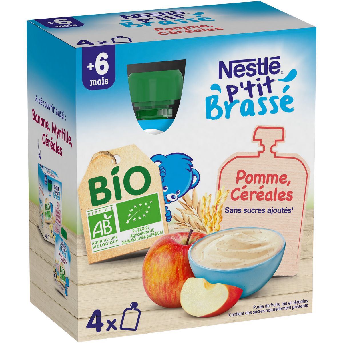 Aliment biologique pour bébé aux purée de fruit, lait et céréales NESTLE P'TIT BRASSE BIO aux céréales, le laitage BIO exprès pour bébé* sans sucres ajoutés** , au bon goût de céréales et de fruits ! Pratique, il s'emporte partout grâce à notre procédé de fabrication spécifique qui permet une conservation hors du frigo. *Conformément à la réglementation sur les aliments pour bébés. ** Contient des sucres naturellement présents