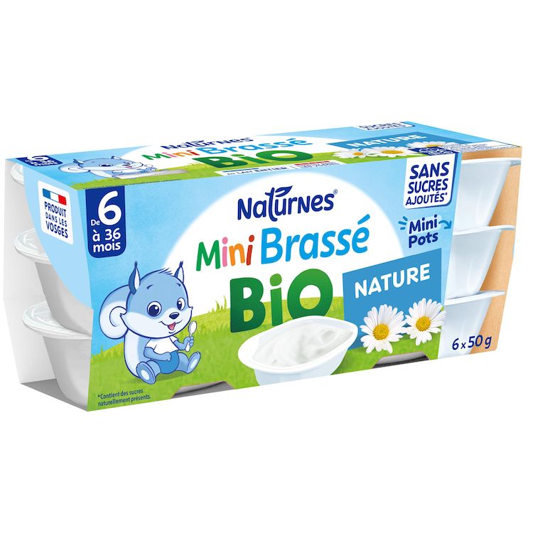 Découvrez Naturnes ® P'tit Brassé Mini Bio Nature Sans Sucres Ajoutés 6x50G, le laitage exprès pour bébé* dès 6 mois ! Au lait entier français, avec une teneur en protéines adaptée* et sans sucres ajoutés**, il est adapté aux besoins nutritionnels de bébé. Un maxi goût dans un format mini, adapté au début de la diversification ! Produit en France, dans les Vosges, sans colorant* ni conservateur* et avec des ingrédients biologiques sélectionnés selon un cahier des charges strict, il peut être donné au dessert ou au goûter. Pratique, il se converse hors du frigo et s'emporte partout ! Avec Naturnes®, bébé nourrit chaque jour sa curiosité, pour une vie pleine de saveurs ! *Conformément à la réglementation des aliments pour bébés. **Contient des sucres naturellement présents