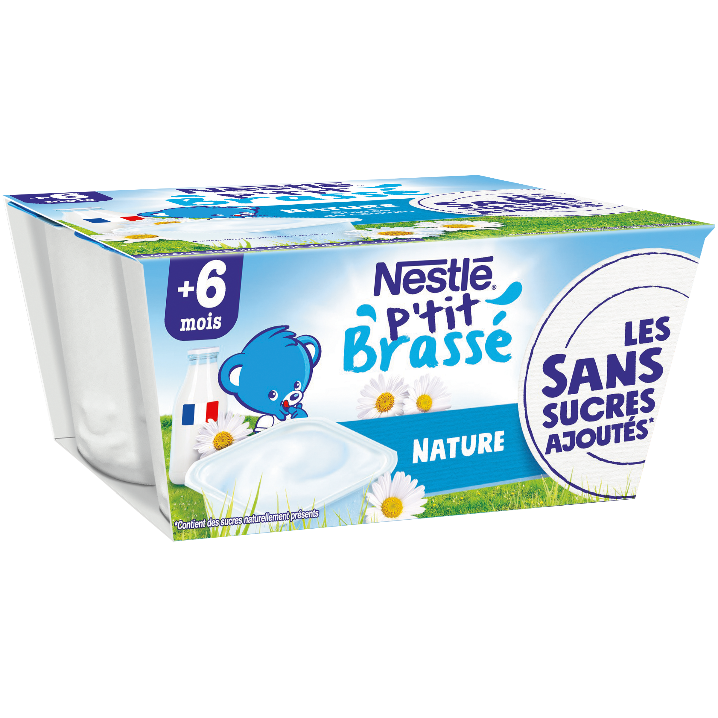 Aliment pour bébés - Dessert lacté NESTLE P'TIT BRASSE Nature Sans Sucres Ajoutés*, le laitage conçu exprès pour bébé**. Produit en France au bon lait entier de nos régions. Du calcium pour contribuer au développement normal des os de bébé. Pratique, il s'emporte partout grâce à notre procédé de fabrication spécifique qui permet une conservation hors du frigo. *Contient des sucres naturellement présents. **Conformément à la réglementation sur les aliments pour bébés.