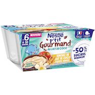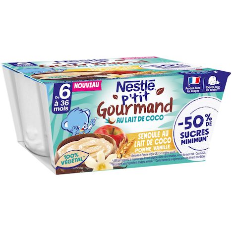 P'tit Gourmand au lait de coco Semoule au lait Pomme Vanille, un P'tit Gourmand 100% végétal* conçu exprès pour bébé**, avec -67% de sucres*** et produit dans les Vosges ! Pratique, il s'emporte partout grâce à notre procédé de fabrication spécifique qui permet une conservation hors du frigo. *Ne contient pas d'ingrédients d'origine animale. **Conformément à la réglementation sur les aliments pour bébés. ***Par rapport à la moyenne des desserts végétaux sans soja aromatisés, sucrés du rayon frais - CIQUAL 2020. Semoule et pomme origine UE, Coco origine non UE.