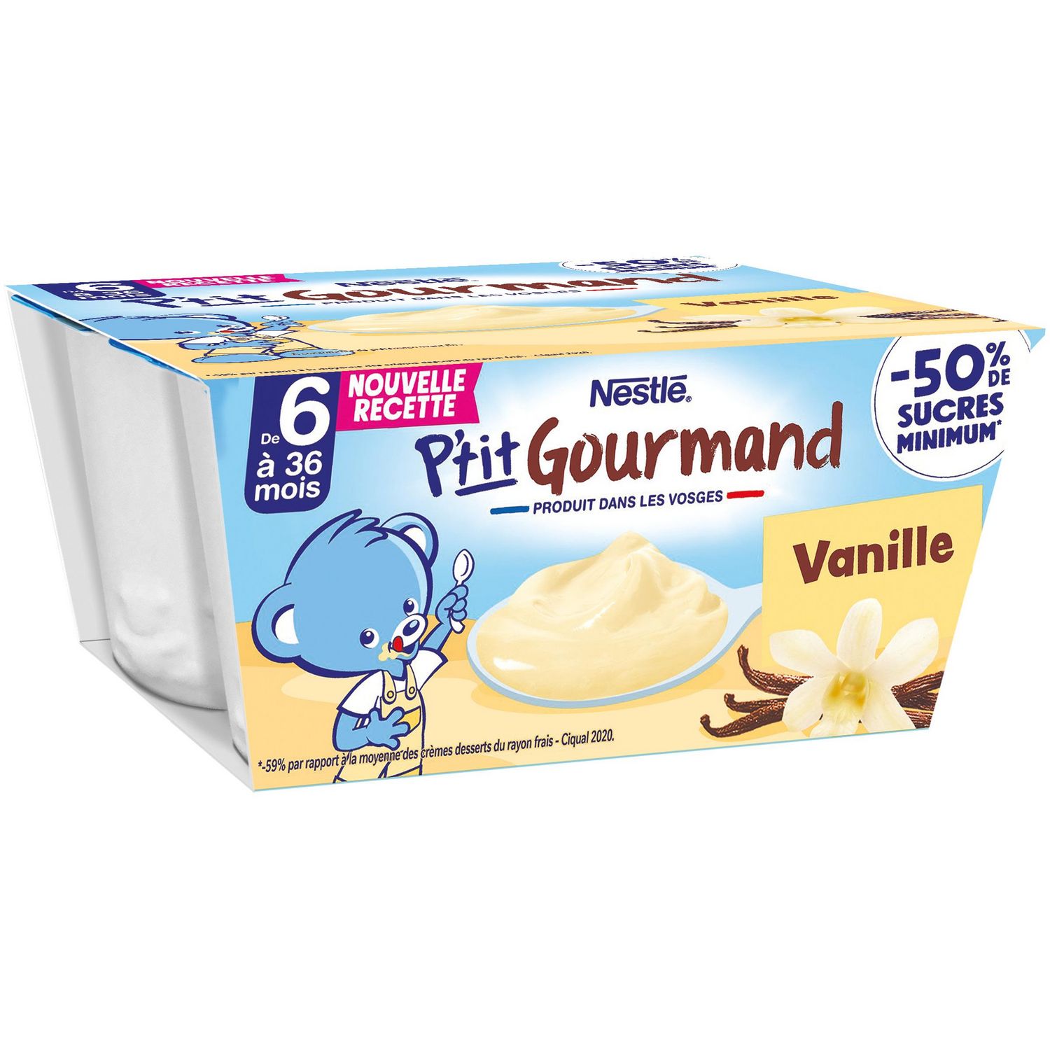 P'TIT GOURMAND Vanille, le laitage qui a du bon conçu exprès pour bébé*, -50% de sucres Minimum**. Élaboré avec des ingrédients de qualité*, ce laitage gourmand au bon goût de cacao ravira ses papilles dès l'âge de 6 mois. Une recette produite dans les Vosges. Pratique pour les parents, ce laitage destiné à bébé vous accompagne partout. Il peut être conservé à température ambiante jusqu'à son ouverture. *Conformément à la réglementation sur les aliments pour bébés. **-59% de sucres par rapport à la moyenne des crèmes desserts du rayon frais - Ciqual 2020.