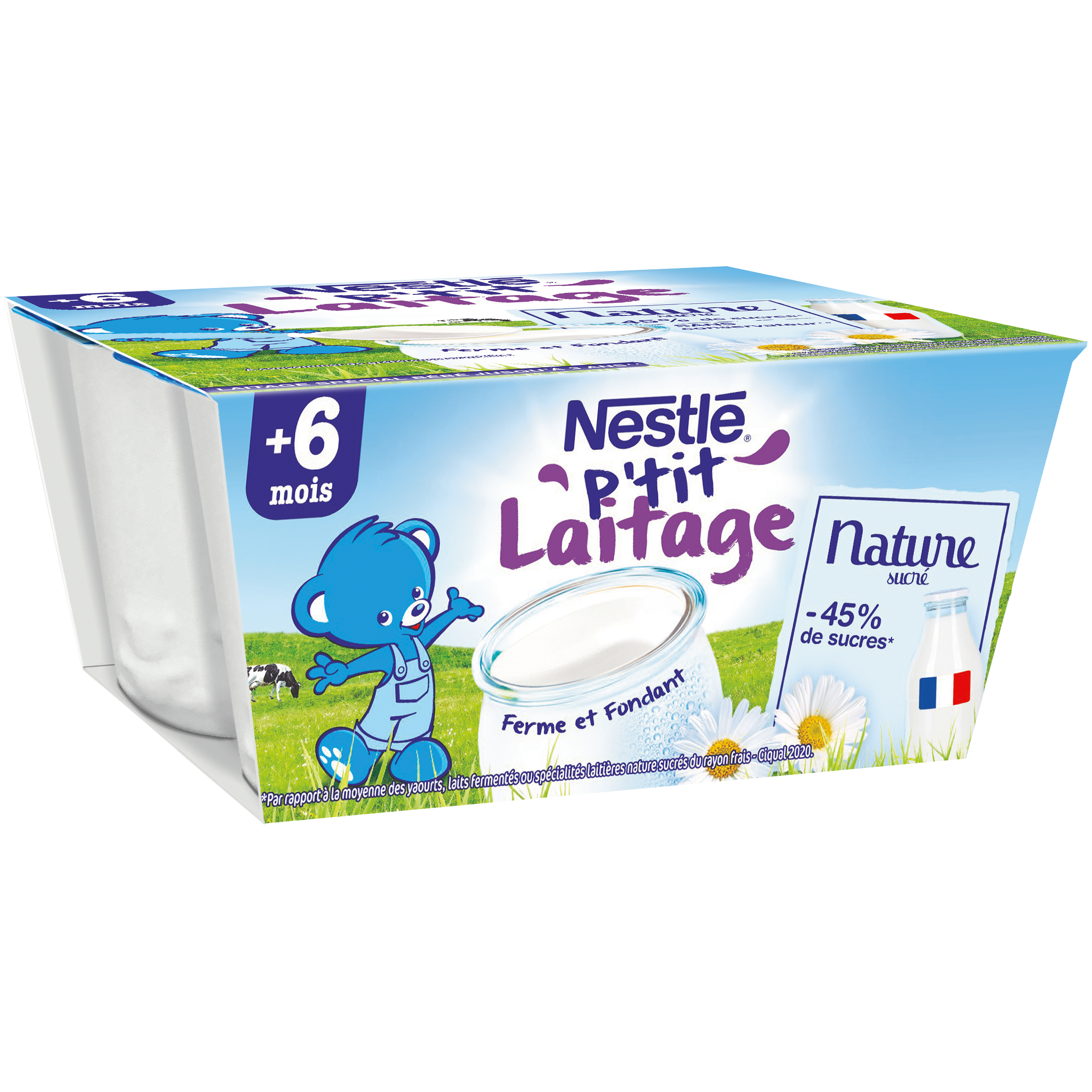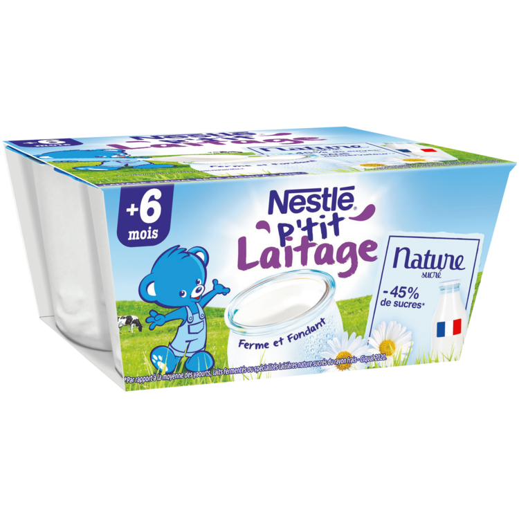 NESTLE P'TIT LAITAGE, le laitage ferme et fondant conçu exprès pour bébé* ! Avec -40% de sucres** et produit en France au bon lait français de nos régions.Pratique, il s'emporte partout grâce à notre procédé de fabrication spécifique qui permet une conservation hors du frigo. *Conformément à la réglementation sur les aliments pour bébés. **Par rapport à la moyenne des yaourts ou spécialités laitières aromatisés sucrés - Ciqual 2016. Aliment pour bébés. Dessert lacté avec arôme naturel
