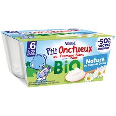 P'TIT ONCTUEUX BIO au fromage blanc NATURE, le laitage BIO à la texture onctueuse conçu exprès pour bébé*, une recette avec -50% de sucres** et produite en France ! Des ingrédients issus de l'agriculture biologique participant au respect de l'environnement et de la biodiversité. Pratique, il s'emporte partout grâce à notre procédé de fabrication spécifique qui permet une conservation hors du frigo. *Conformément à la réglementation sur les aliments pour bébés. **-53% par rapport à la moyenne des yaourts, laits fermentés ou spécialités laitières sucrés du rayon frais - CIQUAL 2020.