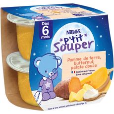 NOUVEAU ! Avant une bonne nuit de sommeil, rien de tel qu'un repas du soir complet. Découvrez P'TIT SOUPER pommes de terre, butternut, patate douce : un petit pot pour bébé dès 6 mois, avec des légumes, des féculents et une touche de crème pour la douceur. Un plat du soir pour bébé cuisiné en France, avec une texture moulinée, sans sel ajouté, spécialement adaptée à bébé ! Pomme de terre, butternut et patate douce et crème origine UE.