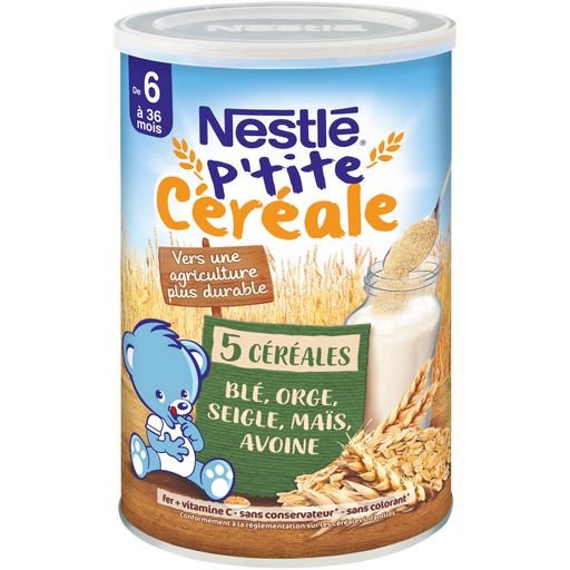 Découvrez NESTLE P'TITE CEREALE, pour aider bébé à bien démarrer la journée, avec un apport exclusif de 5 céréales, vitamines et minéraux. NESTLE P'TITE CEREALE permet d'introduire en douceur le gluten dans son alimentation et de lui faire découvrir de nouveaux goûts et de nouvelles textures ! Le saviez-vous ? Dès 6 mois, 1 biberon seul peut ne plus suffire à couvrir les besoins nutritionnels du petit déjeuner. C'est le moment d'introduire les céréales. Veiller à respecter l'appétit de votre bébé.
