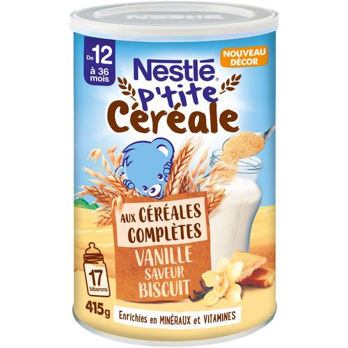 Découvrez P'TITE CEREALE aux céréales complètes Vanille Saveur Biscuit, des céréales exprès pour bébé* issues d'une démarche d'agriculture plus durable dès 12 mois pour l'aider à bien démarrer la journée, avec un apport exclusif de 8 céréales, vitamines et minéraux. NESTLE P'TITE CEREALE permet d'introduire en douceur le gluten dans son alimentation et de lui faire découvrir de nouveaux goûts et de nouvelles textures ! Le saviez-vous ? Les céréales complètes sont des céréales qui ont gardé leur enveloppe extérieure et leur germe, à la différence des céréales raffinées. Elles sont utilisées pour leur qualité nutritionnelle. Veillez à respecter l'appétit de votre bébé. *Conformément à la règlementation sur les céréales infantiles.